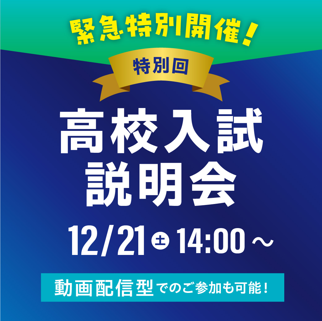 「第3回高校入試説明会」開催後、多くの問い合わせを頂いている状況のため、12月21日(土)に高校入試説明会を追加開催させていただくこととしました。