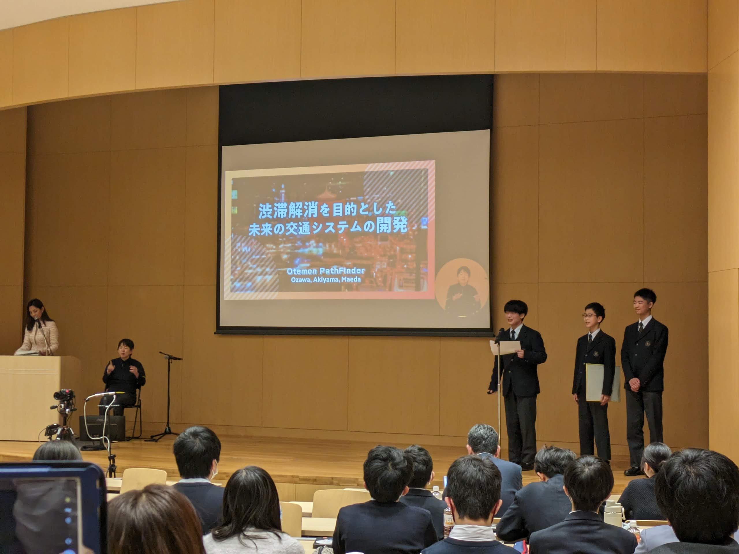 2月15日、立命館大学で「学びの協奏コンテスト」が開催され、国内外のファイナリスト16チームが集結しました。ロボットサイエンス部からは、Otemon Aqua Challenger(研究テーマ:「安全な水を世界に届けたい~自動水質浄化システムの開発~」)とOtemon PathFinder(研究テーマ:「渋滞解消を目的とした未来の交通システムの開発」)の2チームが選抜され、これまでのロボット開発活動について発表しました。結果、Otemon PathFinderが審査員特別賞(STEAM賞)を受賞することができました。小学生から社会人まで、世代をこえた幅広い研究テーマとその解決にふれることができ、今までにない学びをえることができました。また、中島先生(万博プロデューサー)、鈴木先生(元文部副大臣・東大教授)、山極先生(京大総長)をはじめとする著名な研究者の方々から、丁寧なアドバイスをいただき、今後の研究活動を考える上で、大きな糧となりました。