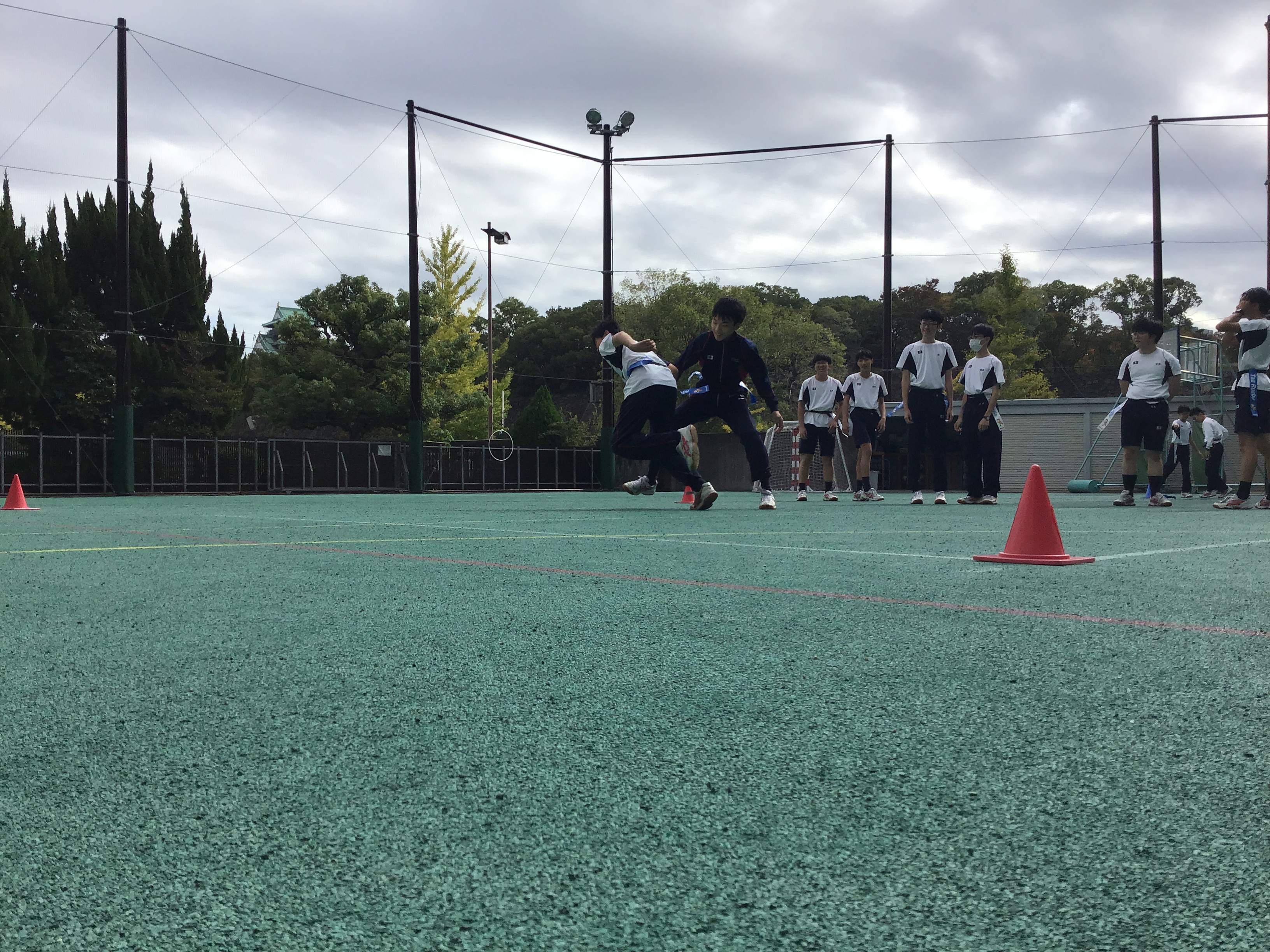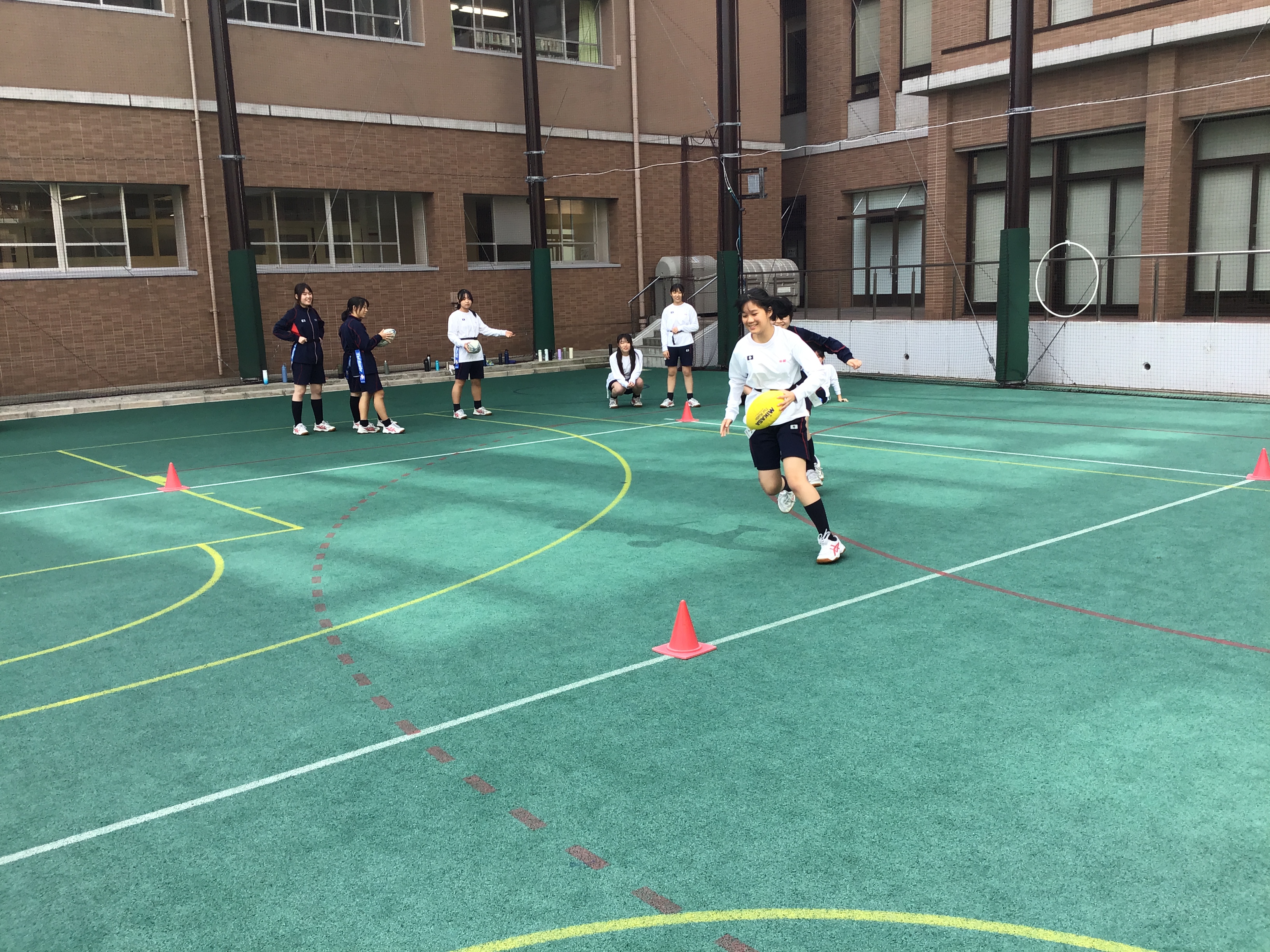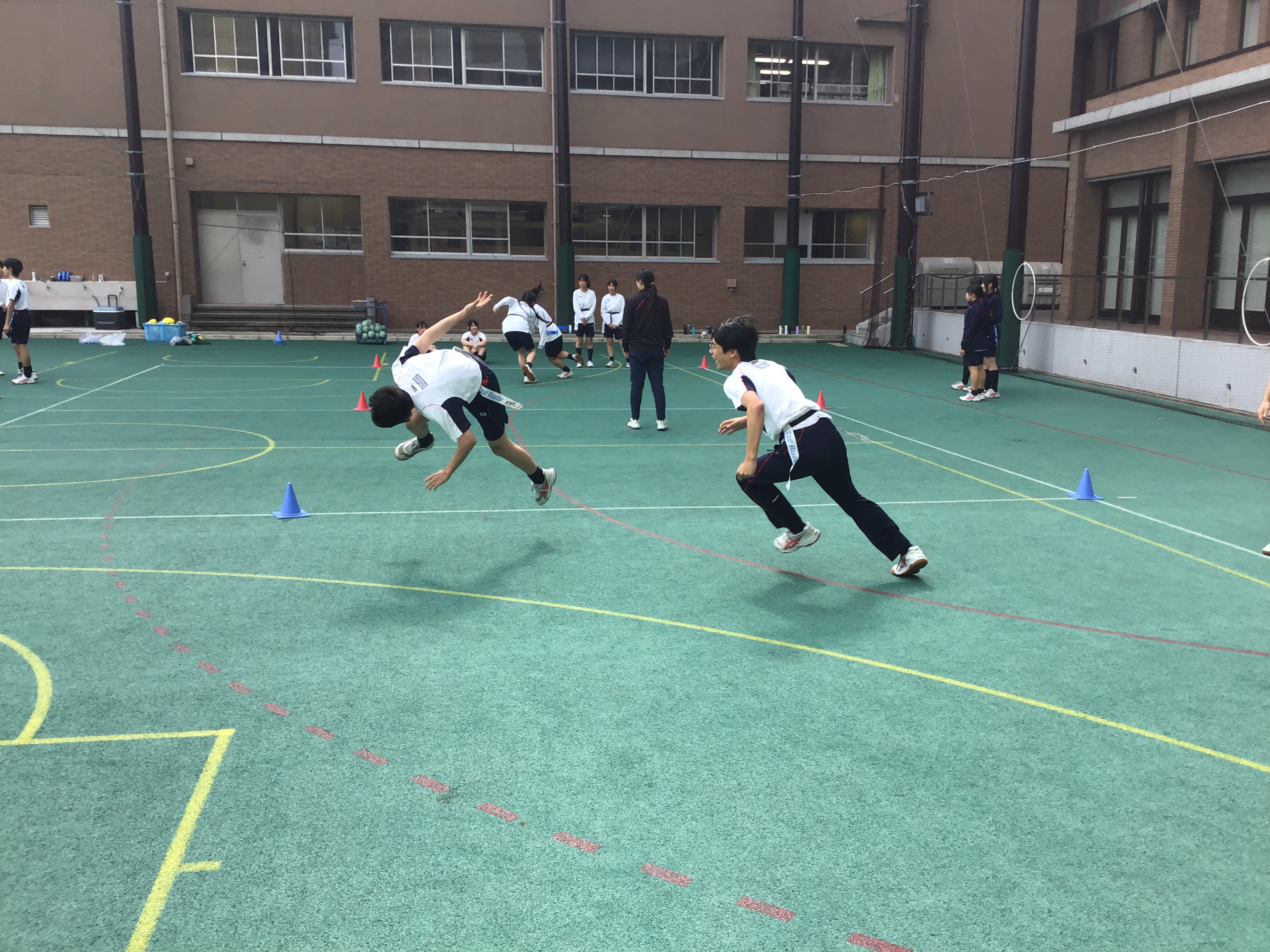 本日は、タグラグビーの試合をより意識しながらの授業内容となっています。 授業の流れ ①ランニング+体操+補強運動 ②1対1のタグ取り ③ランニングパス&GO ※この活動で技能調査も兼ねています。 ④ランニングパス&GOの拡大バージョン 運動量も増えて、コミュニケーションをはかりながら頑張っていました。 頑張れる77期!!!