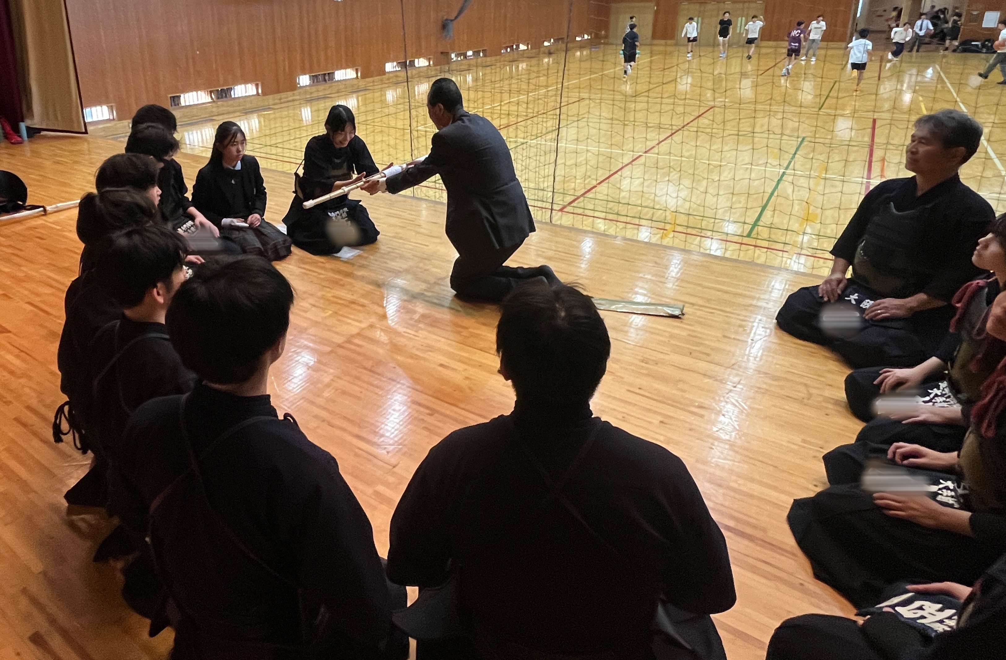 本日、剣道部に追手門学院剣道部OBOG会の網干様がお越しになりました。網干様にはいつも沢山のご支援とご協力をいただいております。本当にいつもありがとうございます。本日は、秋の大会の高戦績へのお祝いと、今年の大会で初優勝するなどの活躍が著しかった高3の髙橋優花選手へOBOG会より褒賞として竹刀を賜りました。ありがとうございました。また春合宿に向けてご支援をいただけるとのことで大変ありがたく存じます。部員の皆さんもこれを励みに頑張ってください。