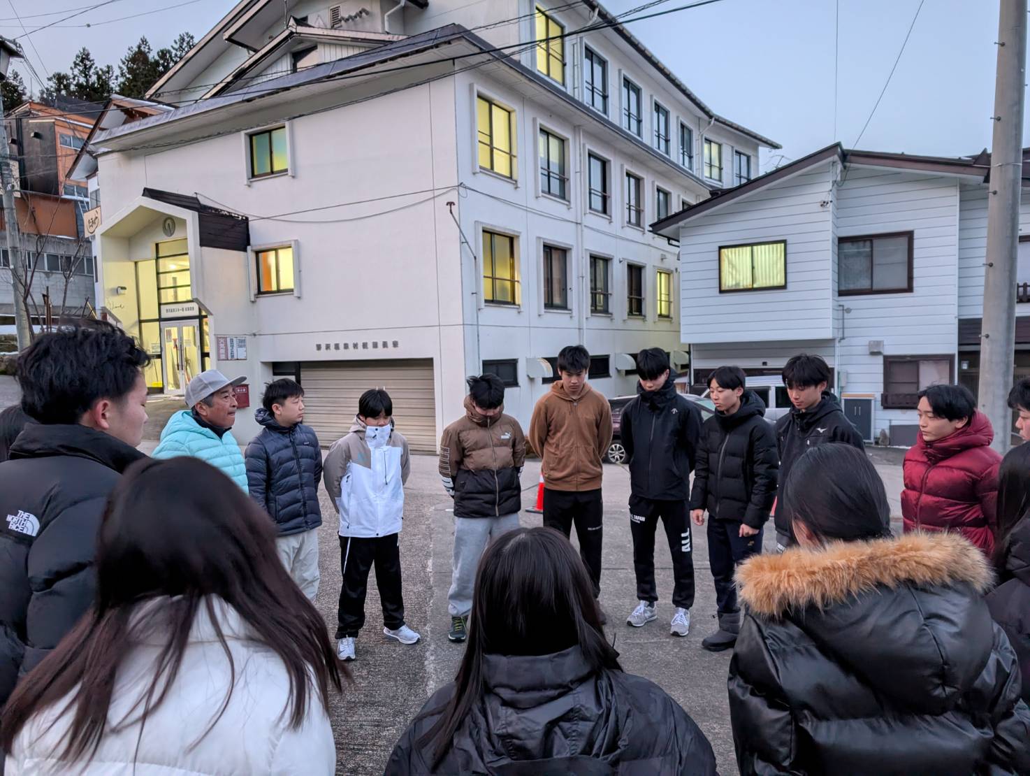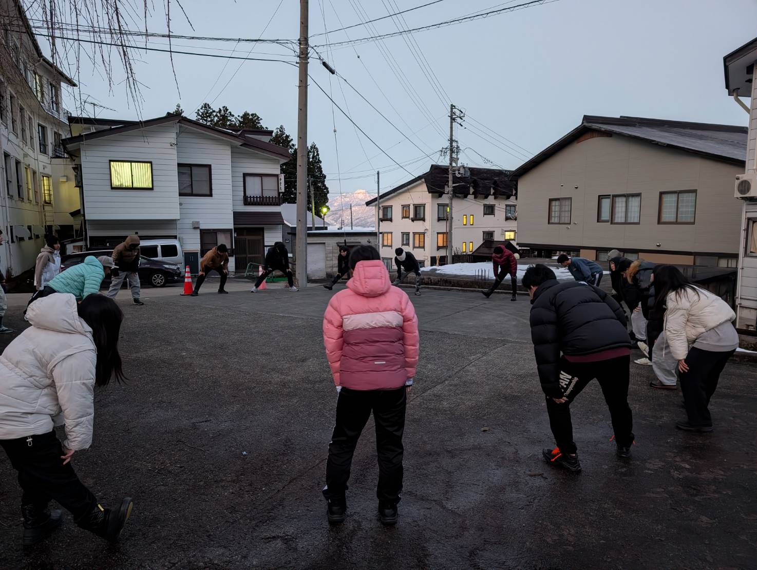 今日は、私たちの朝の一場面をご紹介します。 朝6:30から始まるコンディショニングトレーニング(コントレ)では、まず軽いランニングで体を温め、その後、全員で体操を行いながら体を丁寧にほぐしていきます。 トレーニング後は朝食でしっかりと栄養を補給し、万全の状態で今日も雪上へと向かいました。