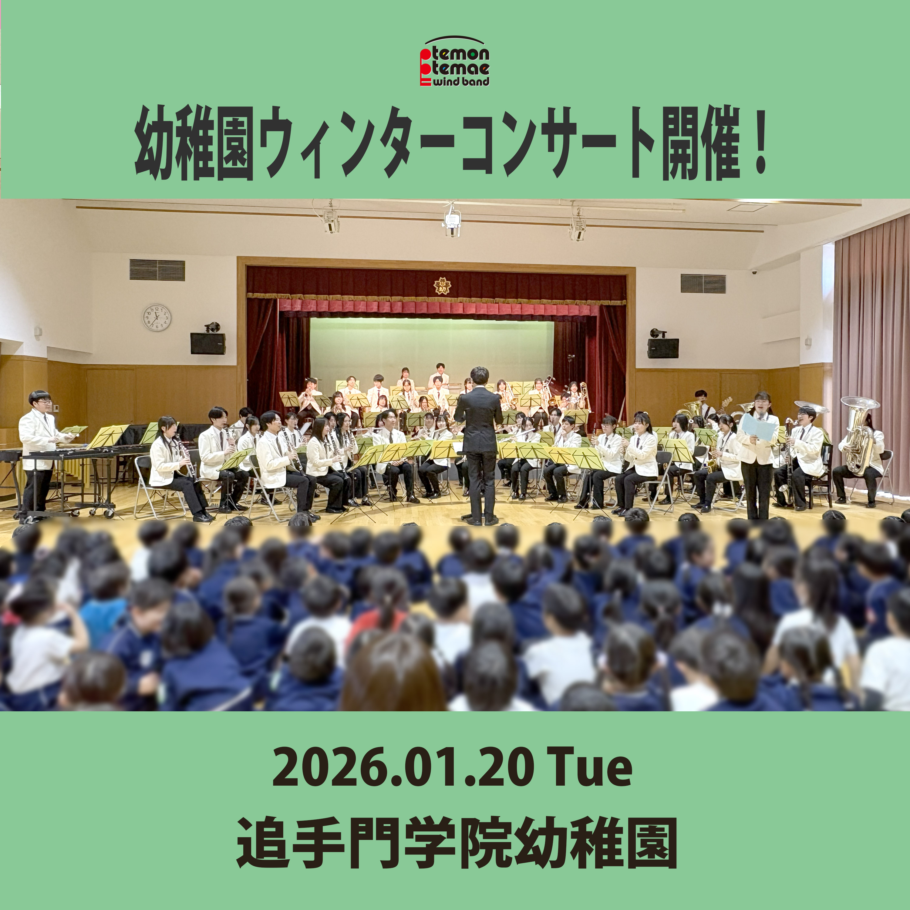 吹奏楽部は追手門学院幼稚園を訪問し、恒例のウィンターコンサートを開催しました! 「ドラえもん」や「踊るぽんぽこりん」など、園児の皆さんも歌ったり、踊り出したりと、とても喜んでくれたようでした! 今後も続けていけたら嬉しいです!