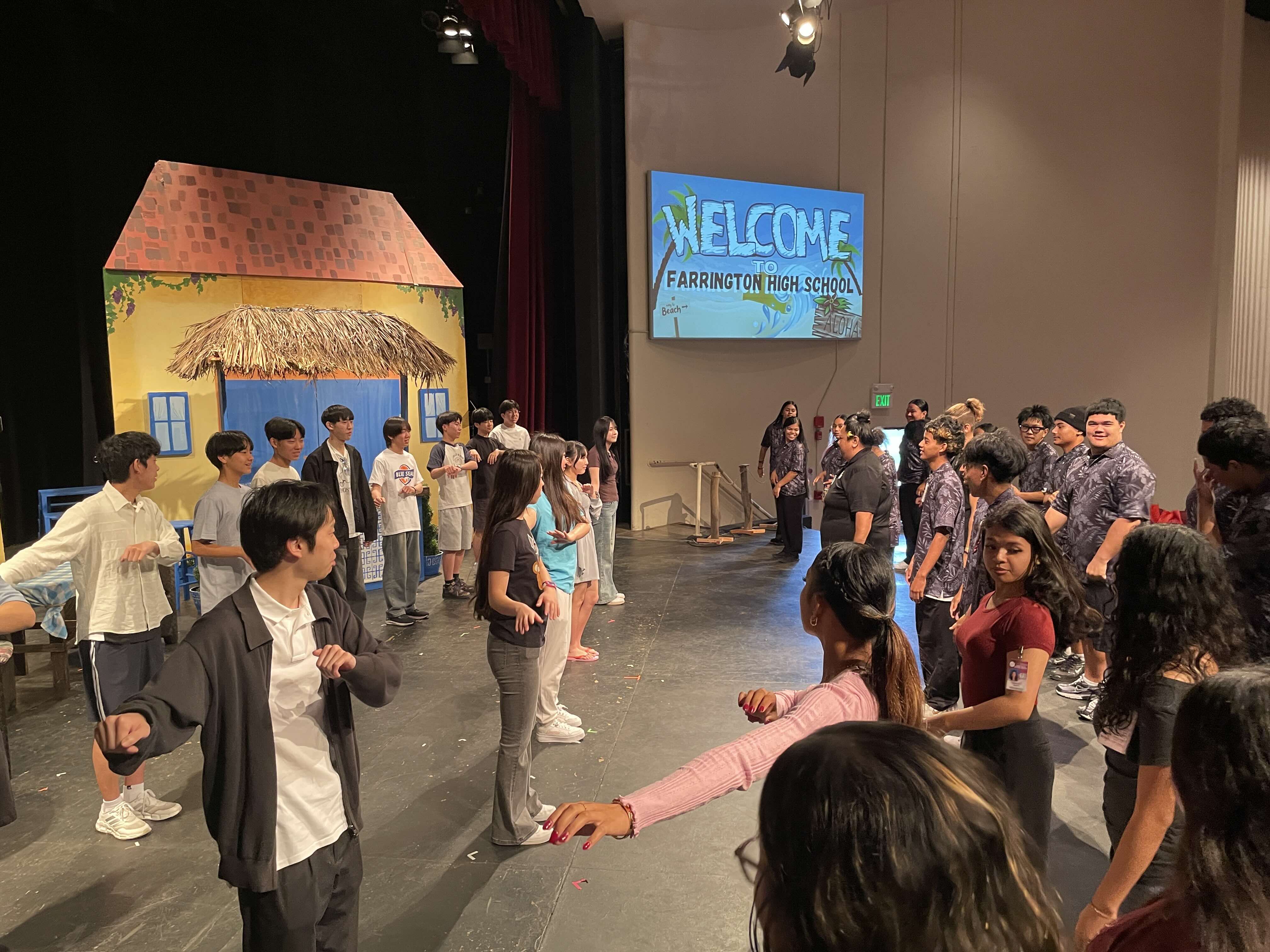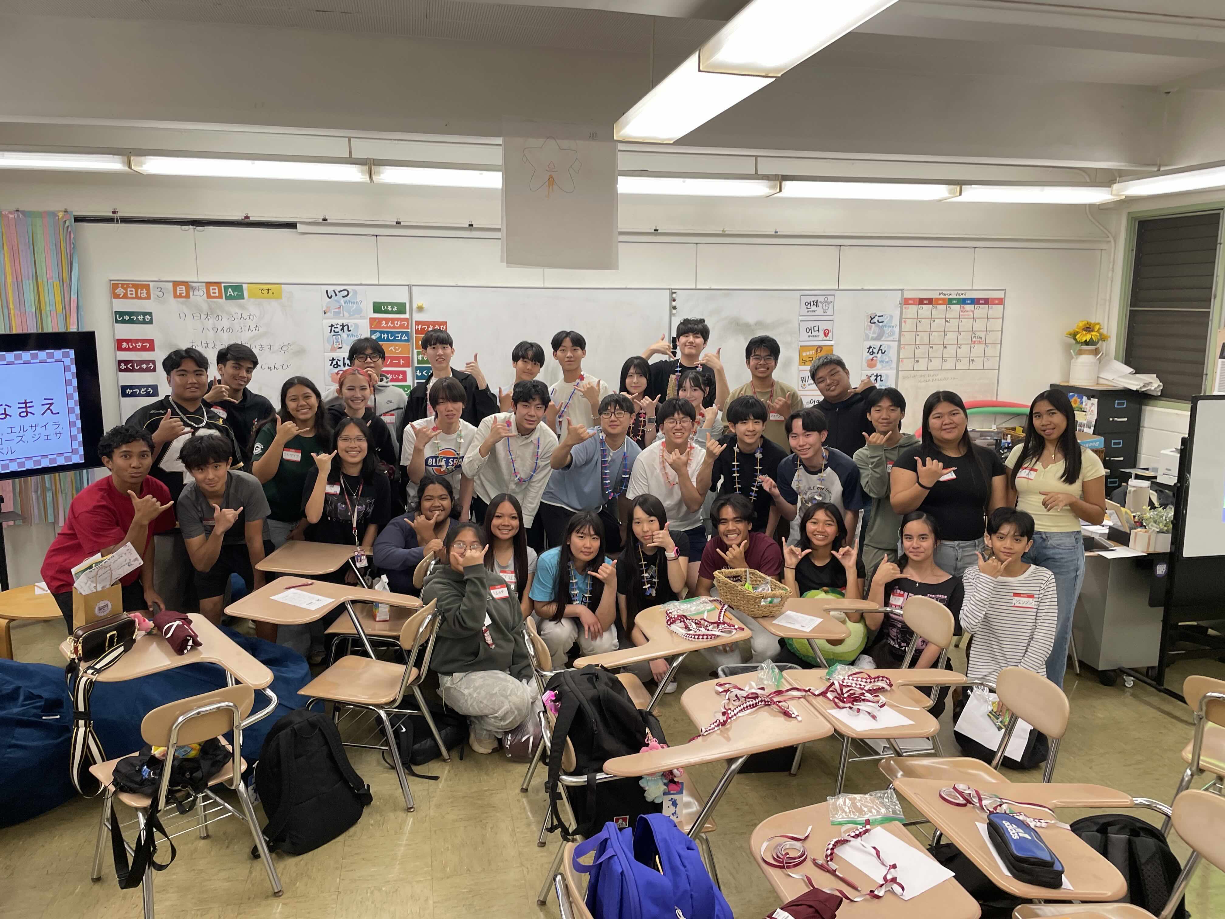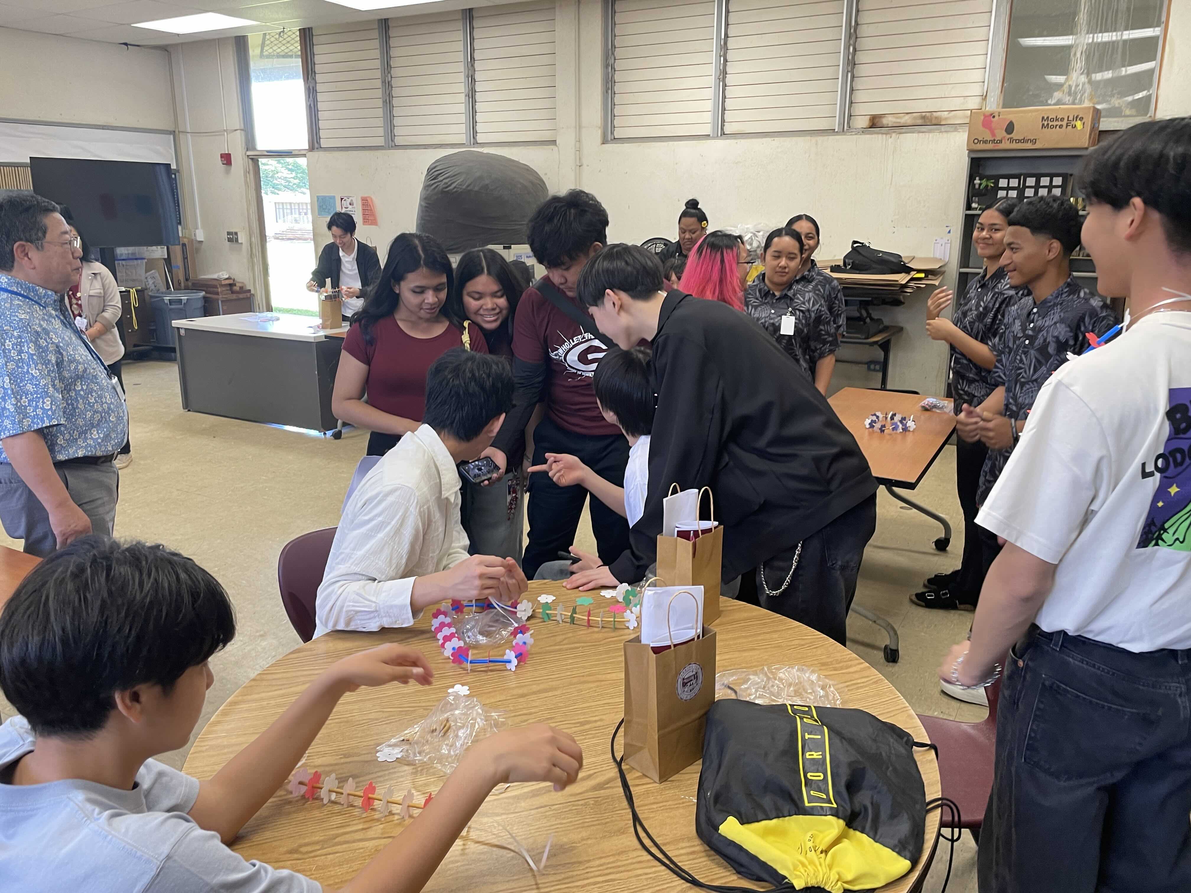 3日目はファリントン高校に行きました。最初はみんな緊張していましたが、現地の人が温かく迎えてくれて、次第に打ち解けていきました。初めにフラダンスを教えてもらい、次にレイを作りました。その後は、昼食を取る時に話したり、校舎見学をしたり、文化交流などたくさんのことをしました。