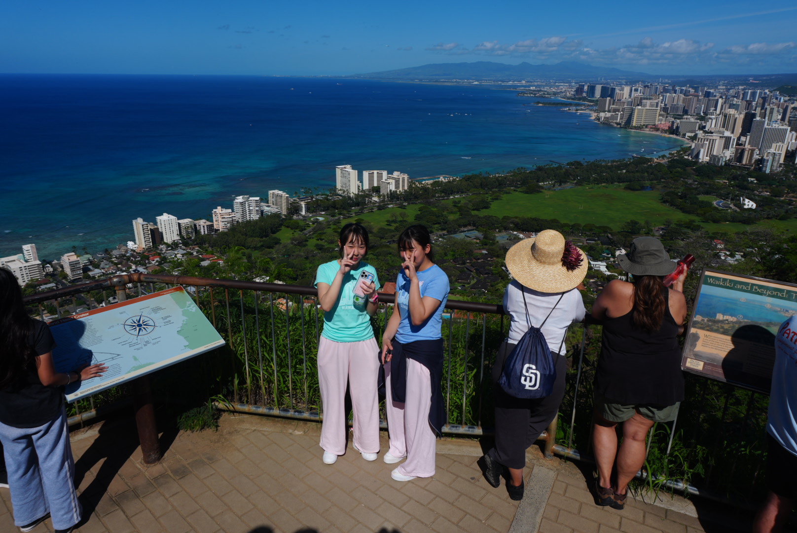 4日目はまずダイヤモンドヘッドを登りました。頂上に登ってみるとハワイを一望でき、綺麗な自然も見ることができ、登った甲斐がありました。降りたところにあるパイナップルジュースが美味しかったです。 その後、戦艦ミズーリ号を見に行きました。 そこでは当時の状況などを鮮明に見ることができ、複雑な感情になりつつも、いろいろなことを学びました。(池尻・大林・鬼追)
