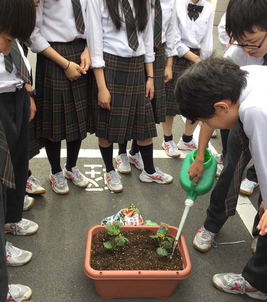 中学2年生では、沖縄学習旅行に向けた事前学習の一環として、正門玄関にてゴーヤーの栽培を行っています。70期生全員で定植から愛情込めて育てていますので、学校にお越しの際はぜひご覧ください。また、今後も成長しましたら続報をお届けする予定です。