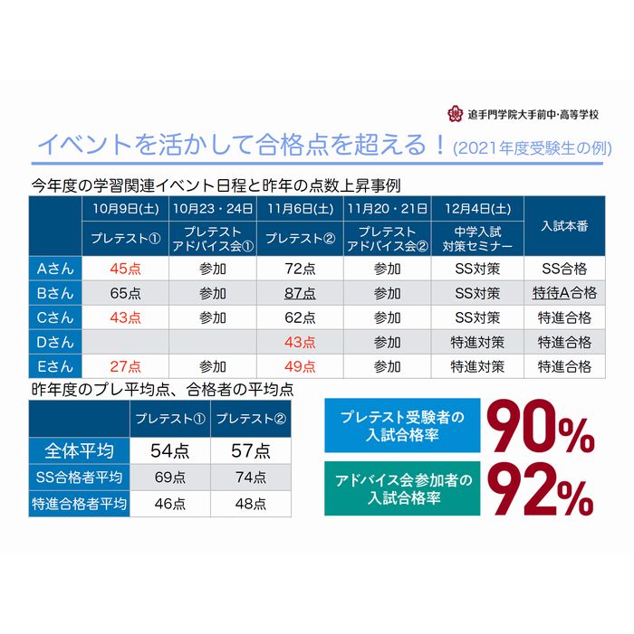 その第1回プレテストを受験頂いた方を対象とした「アドバイス会」を、来る10月23日(土)・24日(日)に開催いたします。「弱点を把握する」「入試本番までの対策を立てる」のに最適なイベントとなっていますので、そちらもあわせてぜひご参加ください。