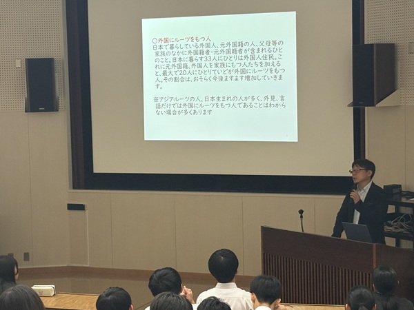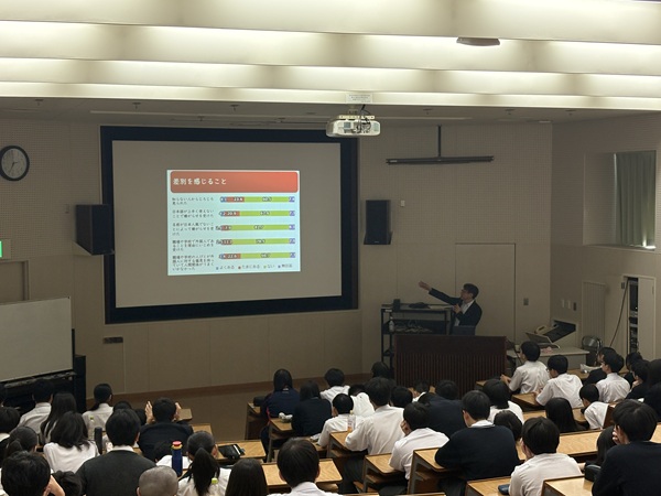 本日のLHRで、NPO法人多民族共生人権教育センターの文公輝氏をお招きして「歴史の中で起こる人権問題」というテーマで講演会を行いました。先日の道徳の授業でパキスタンにおける人権問題を取り上げ、それに関連させ事前学習も行いました。この2日間で生徒たちは日本における人権問題についての知識は深まったと思います。差別のない世の中になるため、我々教員も考える時間となりました。