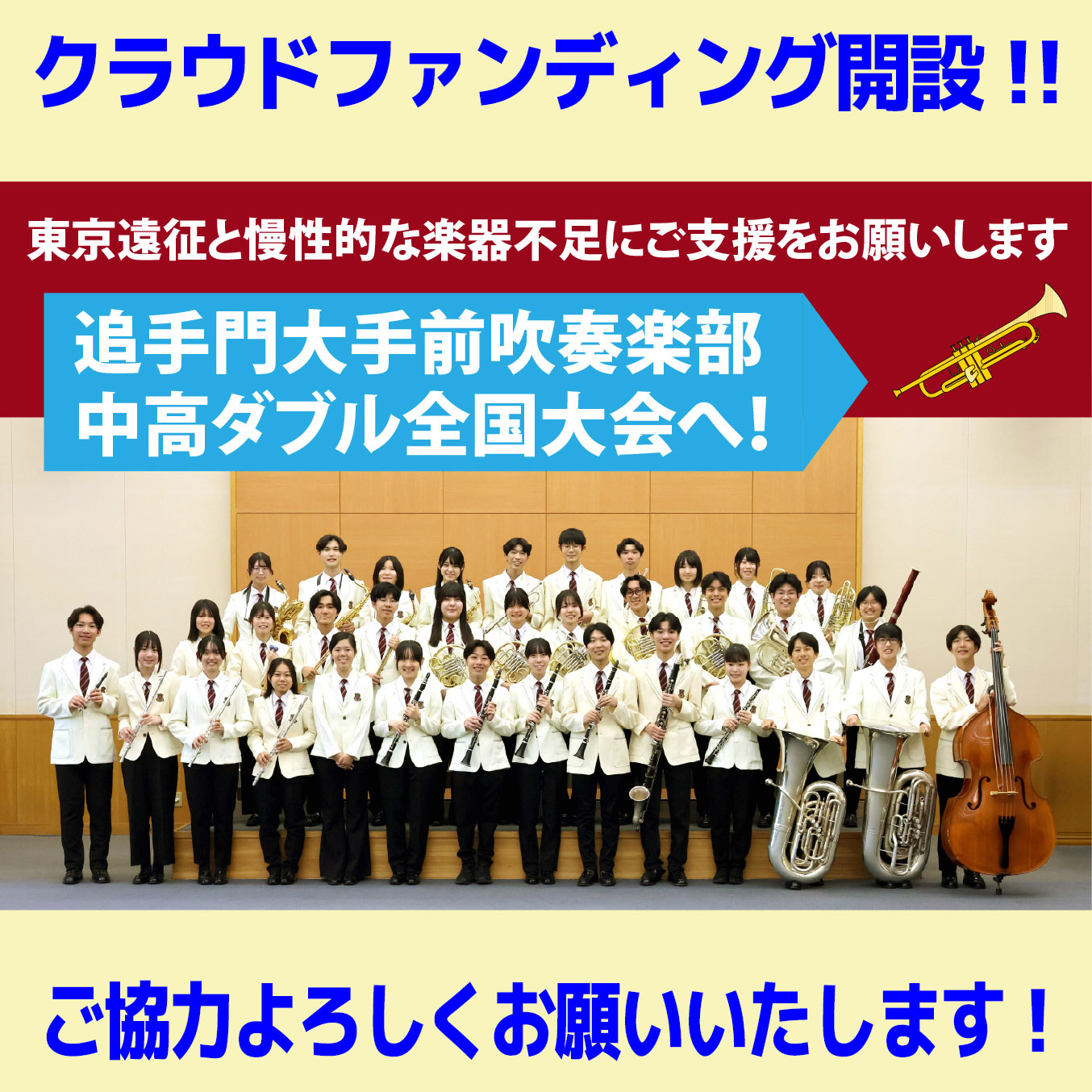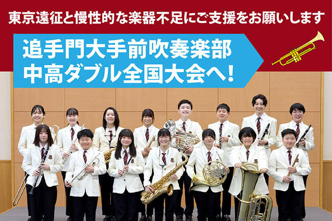 吹奏楽部では、この度「日本管楽合奏コンテスト」全国大会中高ダブル出場のための一部経費と、慢性的な楽器不足・老朽化に対応するため、クラウドファンディングを開設いたしました。ぜひ、開設サイトをご覧いただき、よろしければ皆さまからのご芳情を賜りたく、お願い申し上げます。