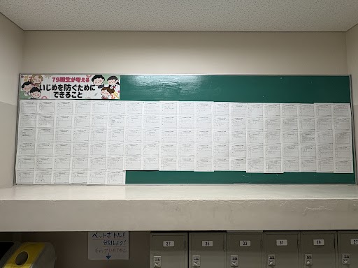 先日、LHRで作成した「いじめ防止標語」が完成しました。完成した標語は現在廊下に掲示されており、誰もが安心して過ごせる学校づくりへの意識を共有しています。