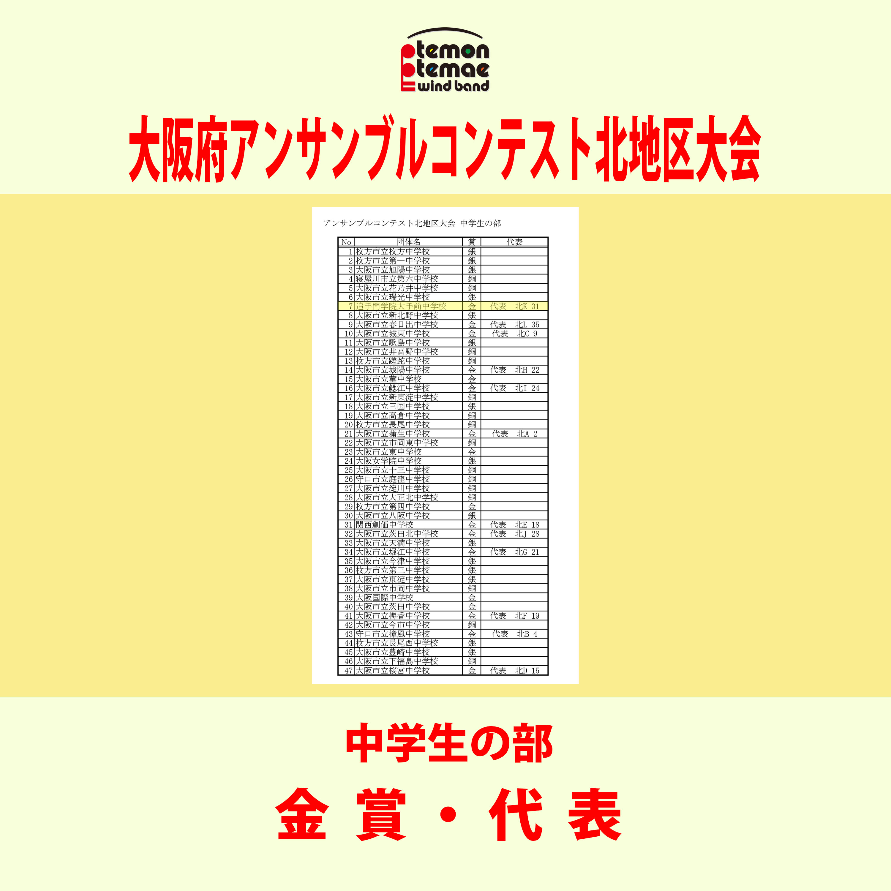大阪府アンサンブルコンテスト北地区大会 中学生の部 金賞・代表!
