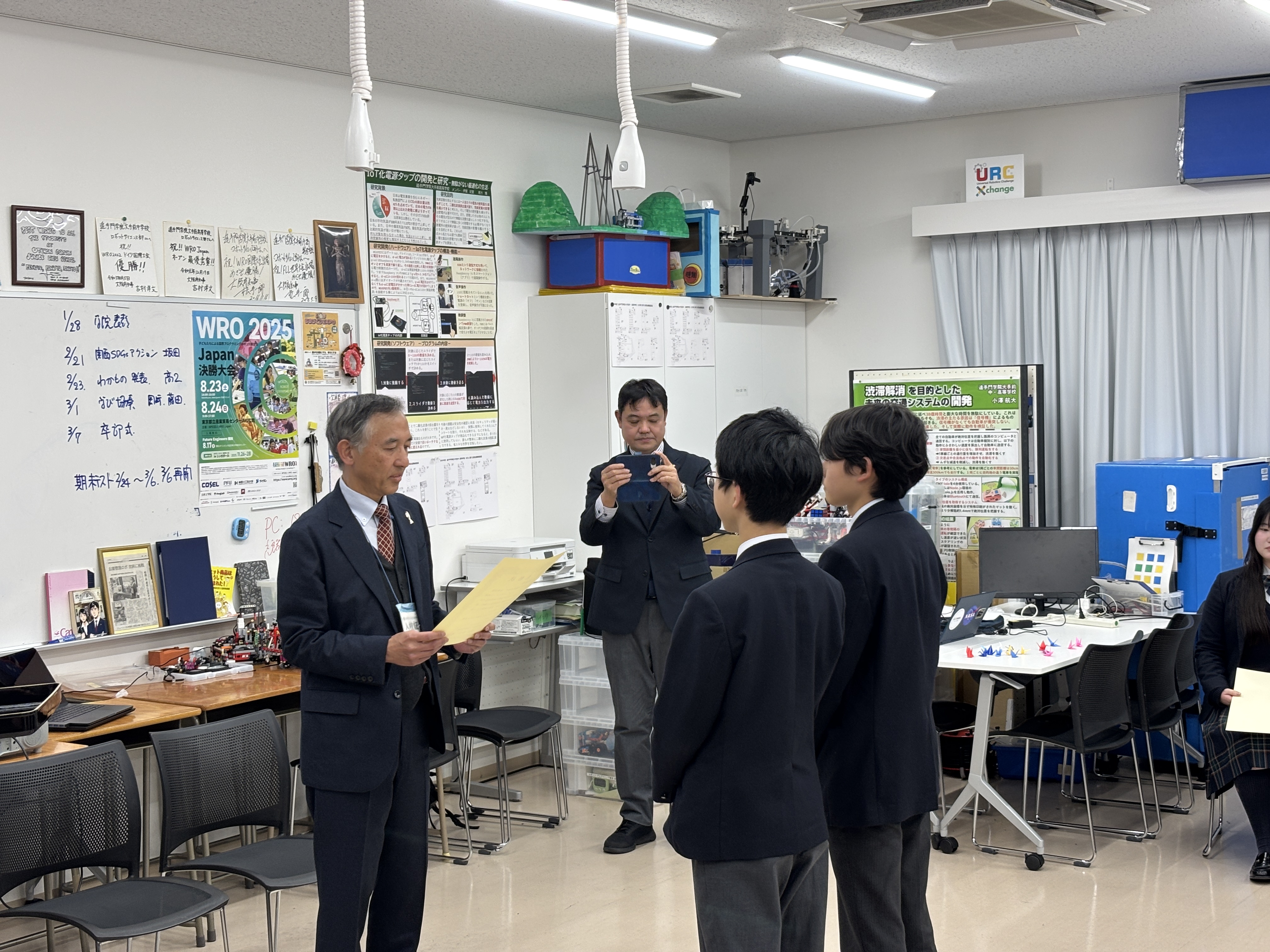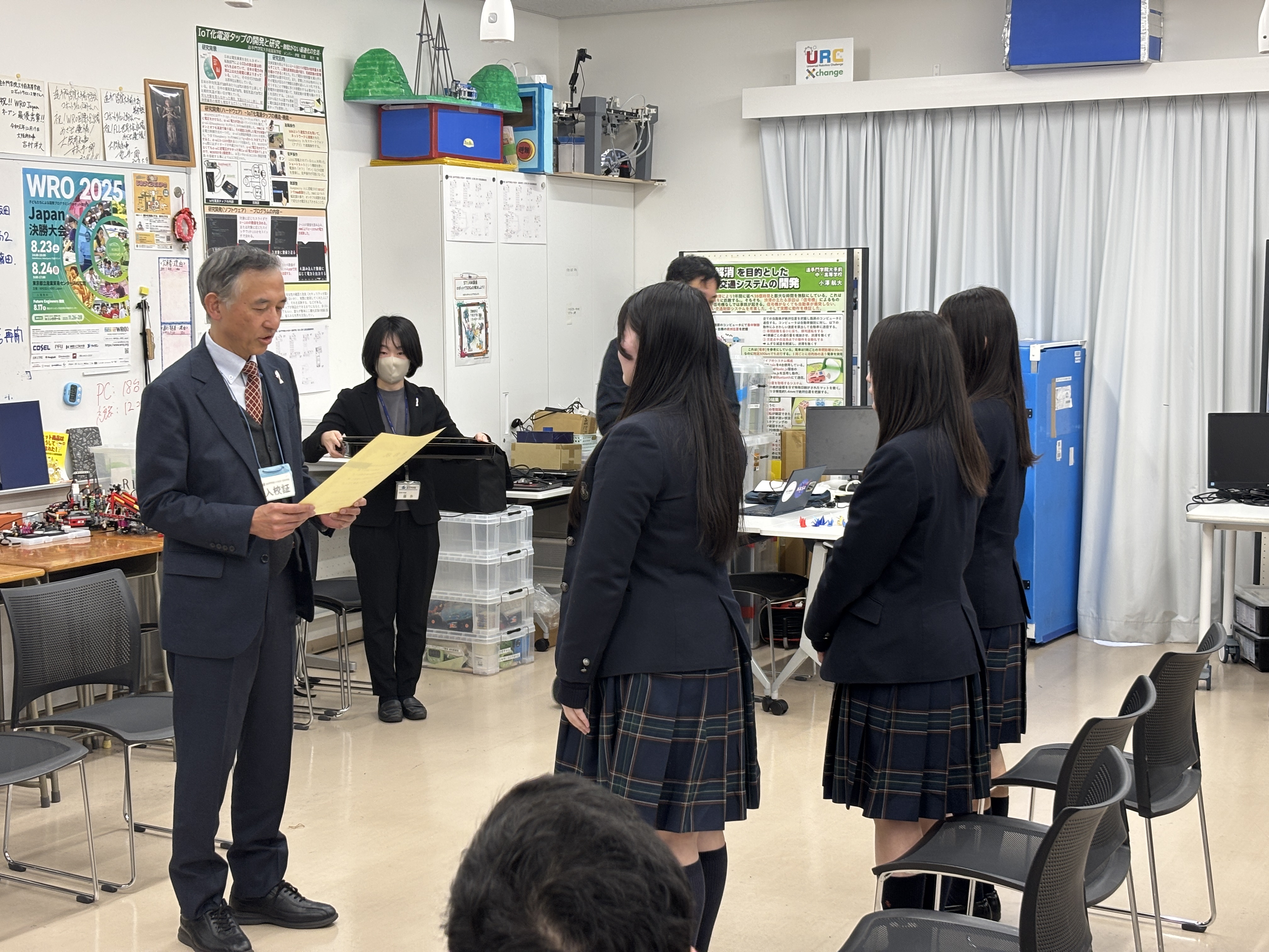 2団体目は、「ロボットサイエンス部」です。同部は、WRO International Final 2024 トルコ大会に出場し、Robo Mission Junior部門において世界21位という成績を収めました。表彰後には、ロボット・プログラミング教育研究推進室長の福田教諭より挨拶があり、活動の様子を紹介する動画の上映や、部員代表からの言葉が述べられました。
