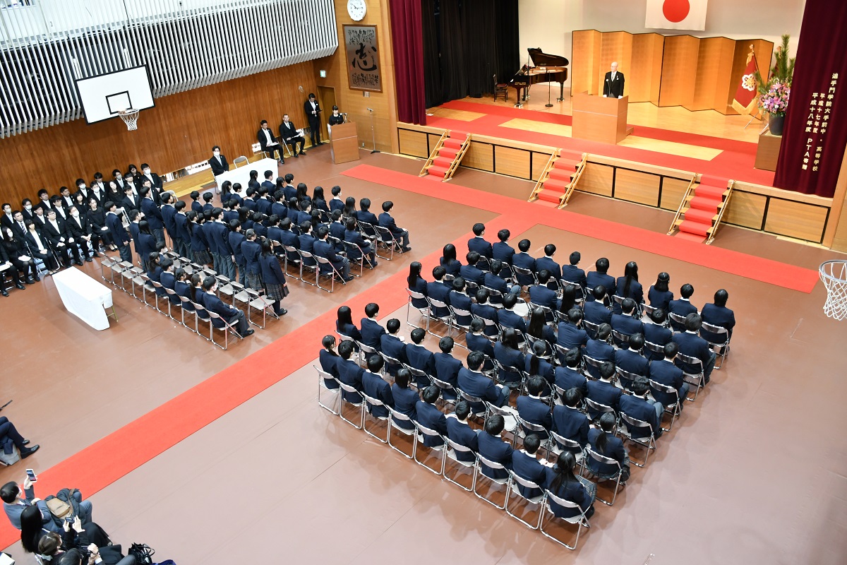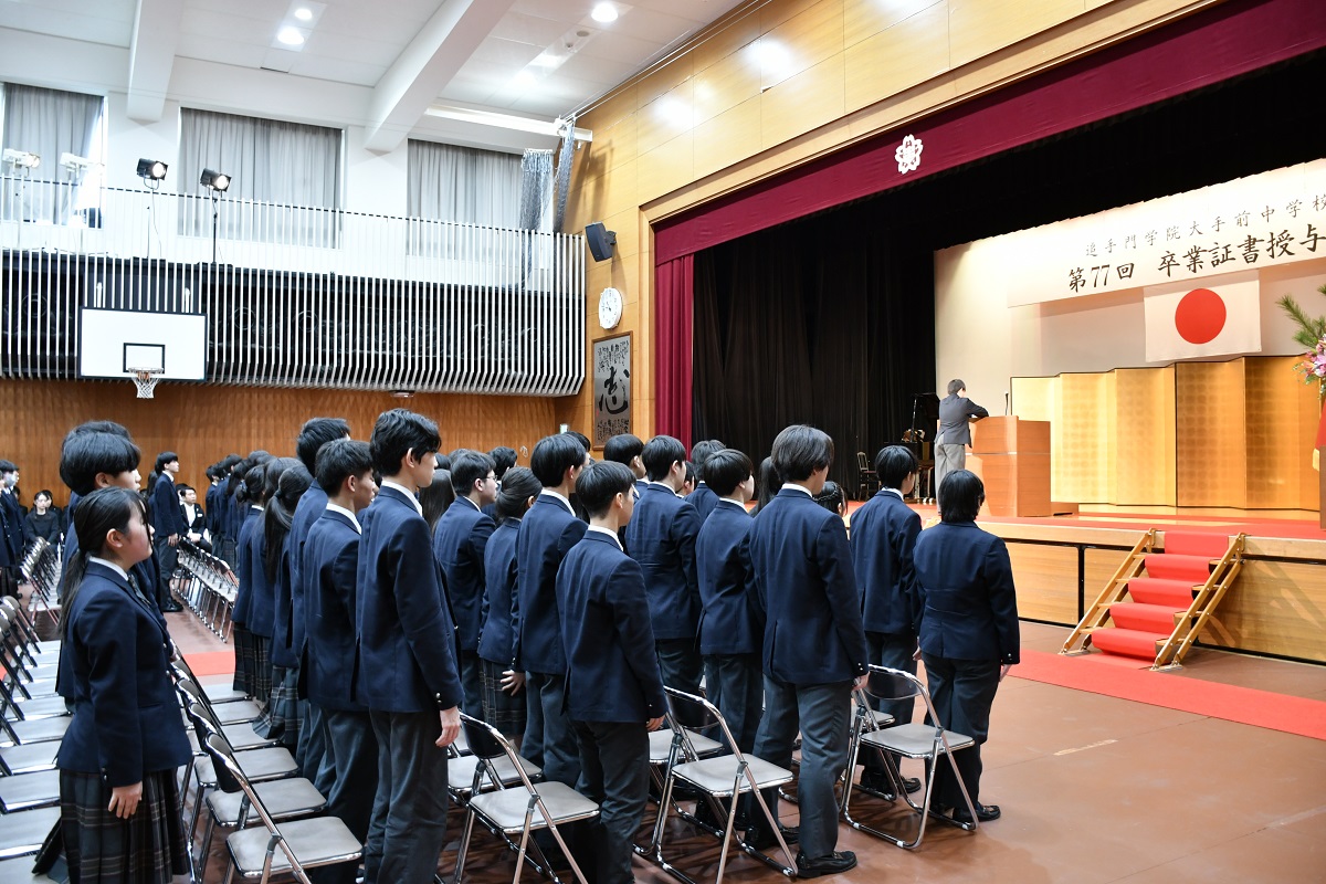 3月7日、追手門学院大手前中学校 第77期生の卒業証書授与式が体育館にて挙行されました。式辞では、これまで仲間とともに過ごした3年間の学びや成長を振り返るとともに、これからの高校生活に向けて、自ら問いを立て、主体的に学び続けることの大切さが伝えられました。卒業生たちは、本校で培った学びや仲間との絆を胸に、それぞれの新しいステージへと進んでいきます。今後のさらなる活躍を心より期待しています。