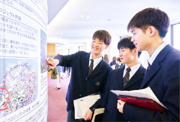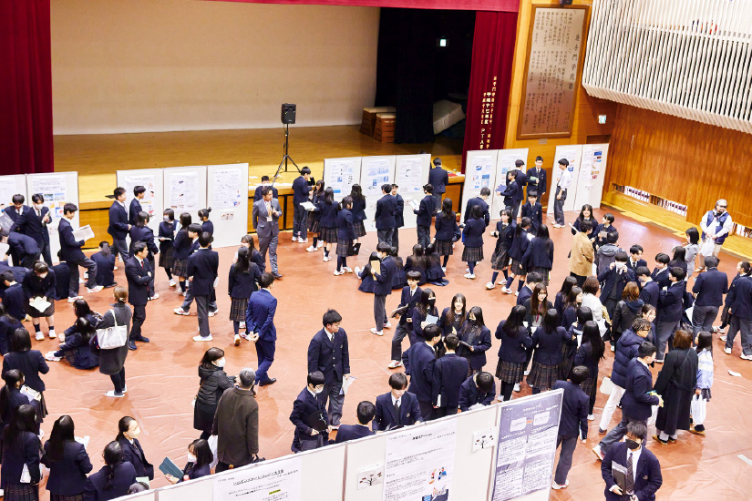 探究活動の成果発表を、学校全体を会場に開催。生徒の主体性・思考力を表面化させる。