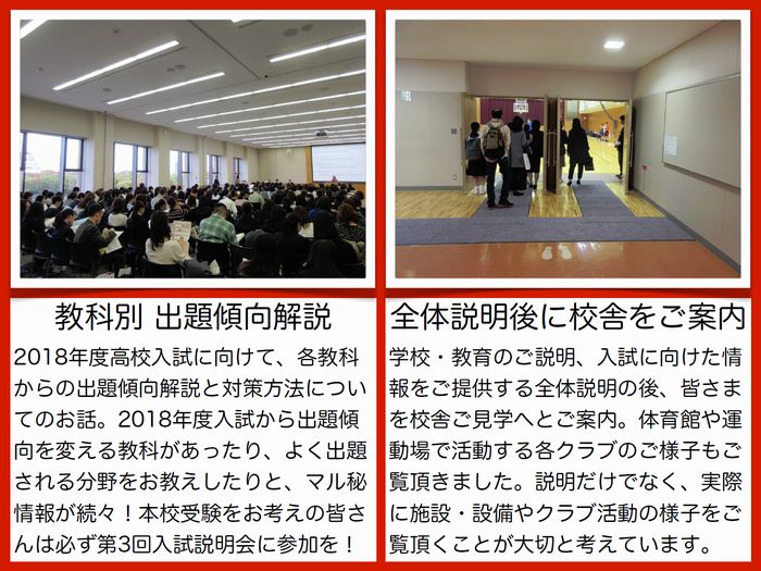 今回の高校入試説明会の様子を少しでもお伝えしたく、下記には写真に簡単な紹介文を添えたものを掲示しています。当日の雰囲気を感じ取っていただければ幸いです。