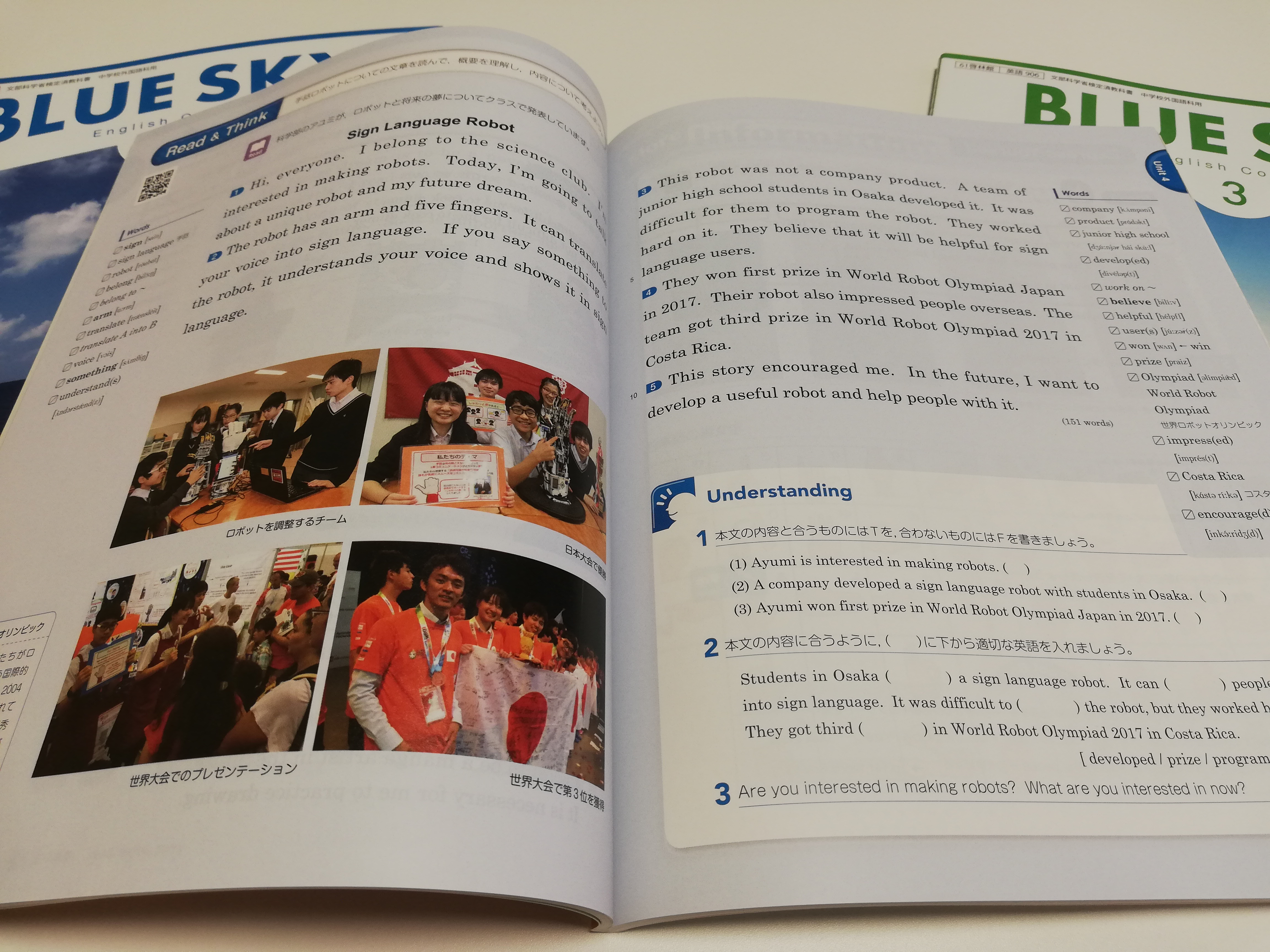 来年の新しい中学英語の教科書(啓林館)に、私たちの手話通訳ロボットの活動が紹介されます。たくさんの新聞やテレビで紹介いただきましたが、まさか教科書に・・・。驚きをかくしきれません。これからもロボットサイエンス部では、SDGsを解決するロボット開発に挑み続けます。