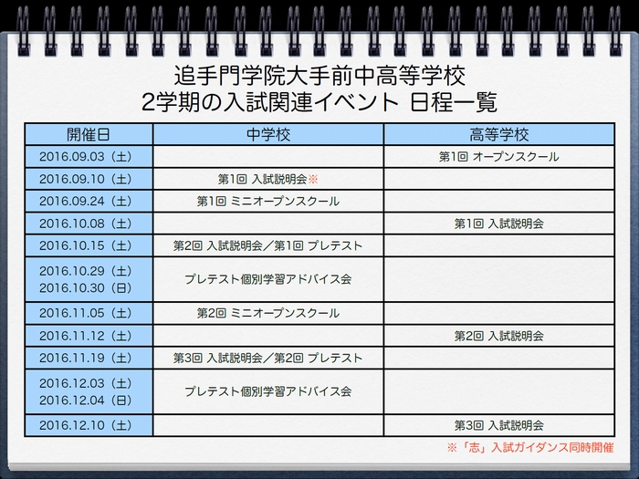 追手門学院大手前中高等学校では、受験生・保護者の皆さまの受験校選択の一助となるよう、2学期以降も積極的に入試関連イベントを開催いたします。 2学期中に開催予定となっている中学入試・高校入試それぞれに関するイベント実施予定は次の画像の通りとなっています。 多くの皆さまにご来校いただけるよう、どの回も趣向を凝らしたプログラム構成にしております。ぜひ、お気軽にご来校下さい。