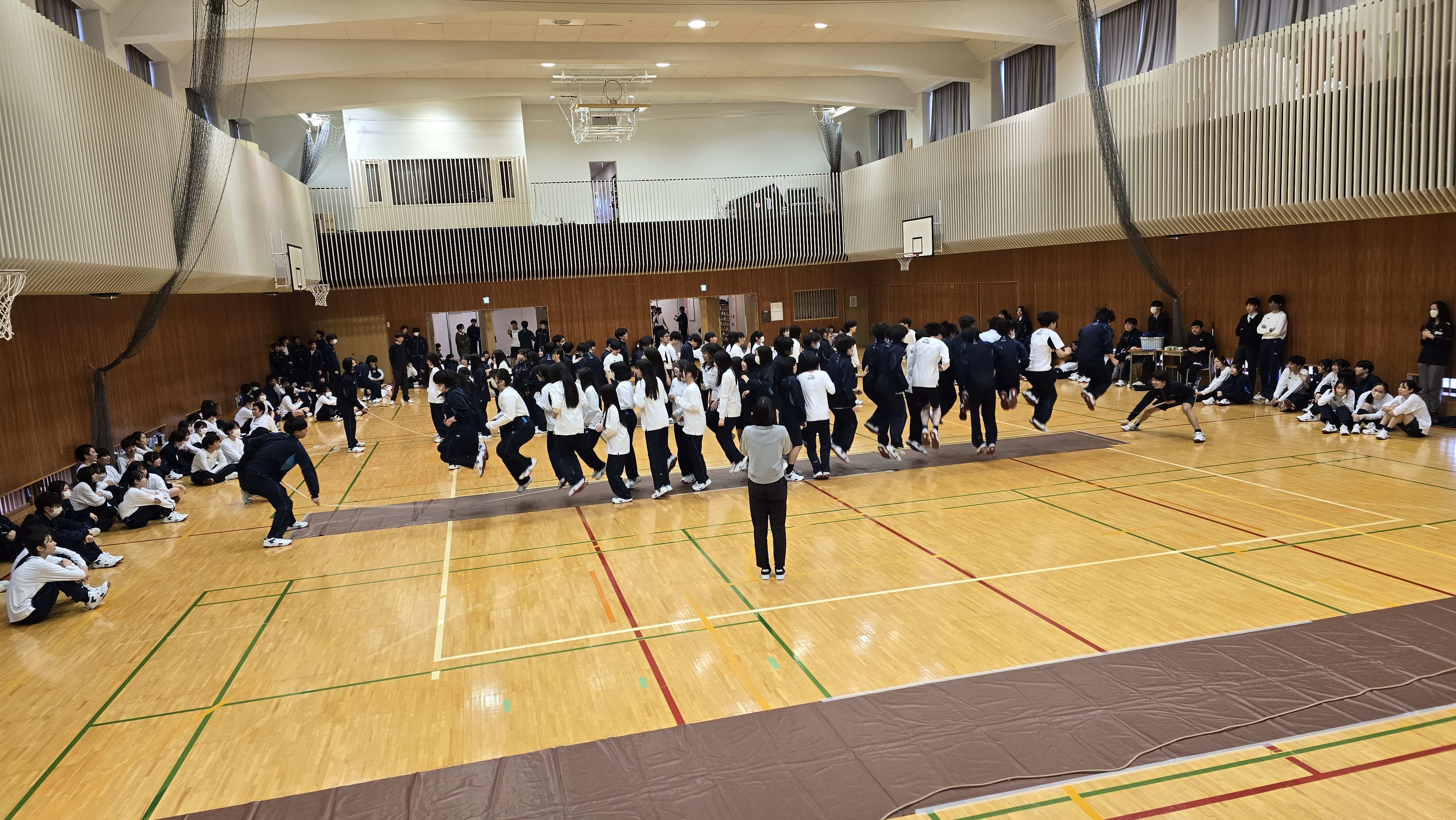 卒業生の方の講話の翌日は、学年によるレクリエーション大会が実施されました。その名も下司カップ!高2担任団の下司先生の熱い思いのもと、本企画が実現いたしました。内容はクラス対抗の大繩大会です。クラス全員で1回で大繩を連続で飛んだ回数を競うというもので、クラスごとに練習時間を1時間程度設けたあと本番という流れで実施されます。最初は、1回でも成功させるのに苦労するクラスがほとんどでしたが、男女で分けて飛ぶ、1列になる、など工夫をしながら何度も練習を重ねるうちに徐々にクラス全体がコツをつかんでいる様に見え、クラスの一体感が試される瞬間でした。優勝は1組。難易度が高い中11回連続を飛んでの優勝となりました。声かけも素晴らしかったですし、クラスの絆がとても伝わってきました。ほかのクラスも縄を回す人中心によく声を出していました。新年度に向けて、最高の思い出になってくれたことを願ってやみません。