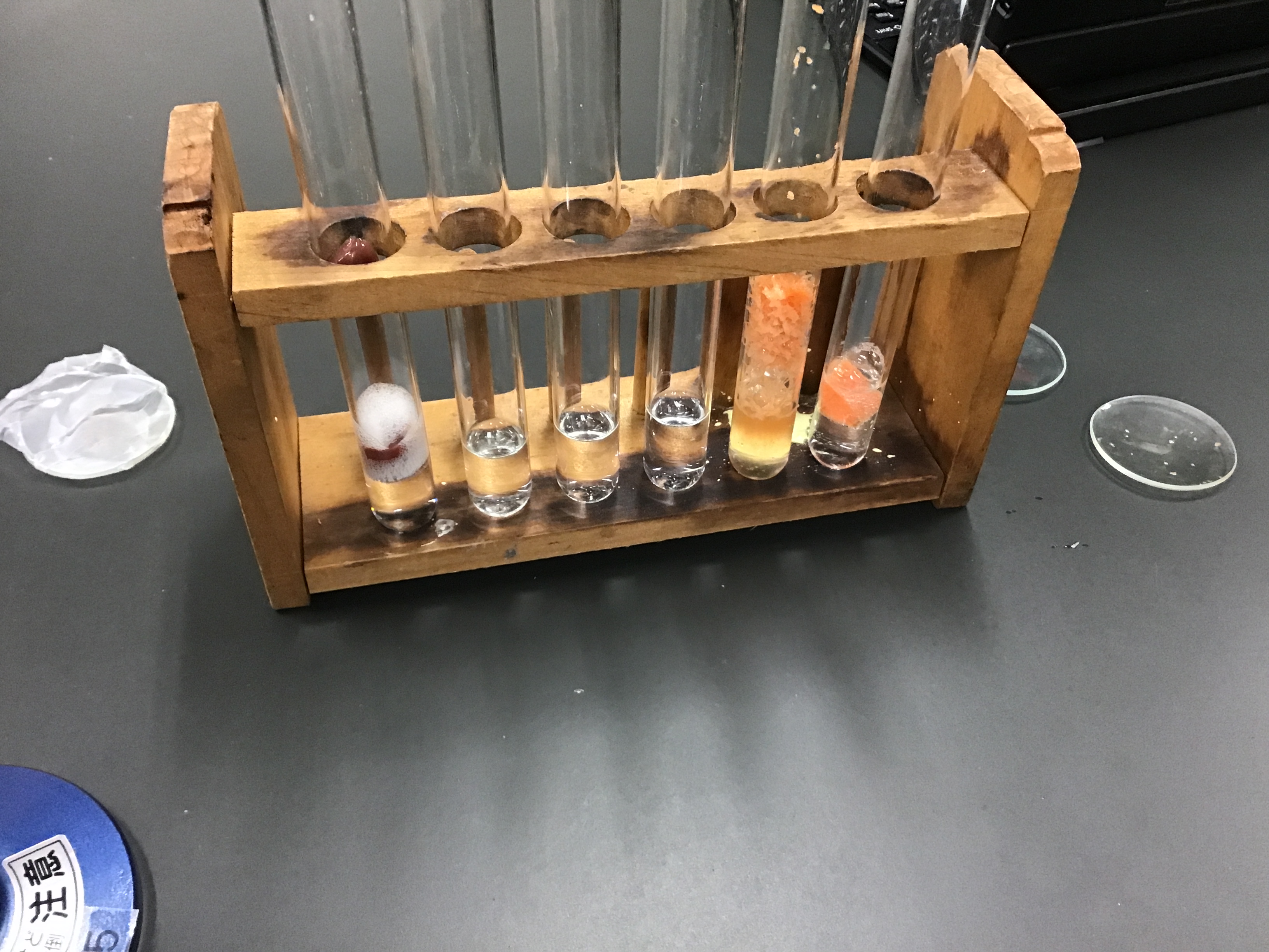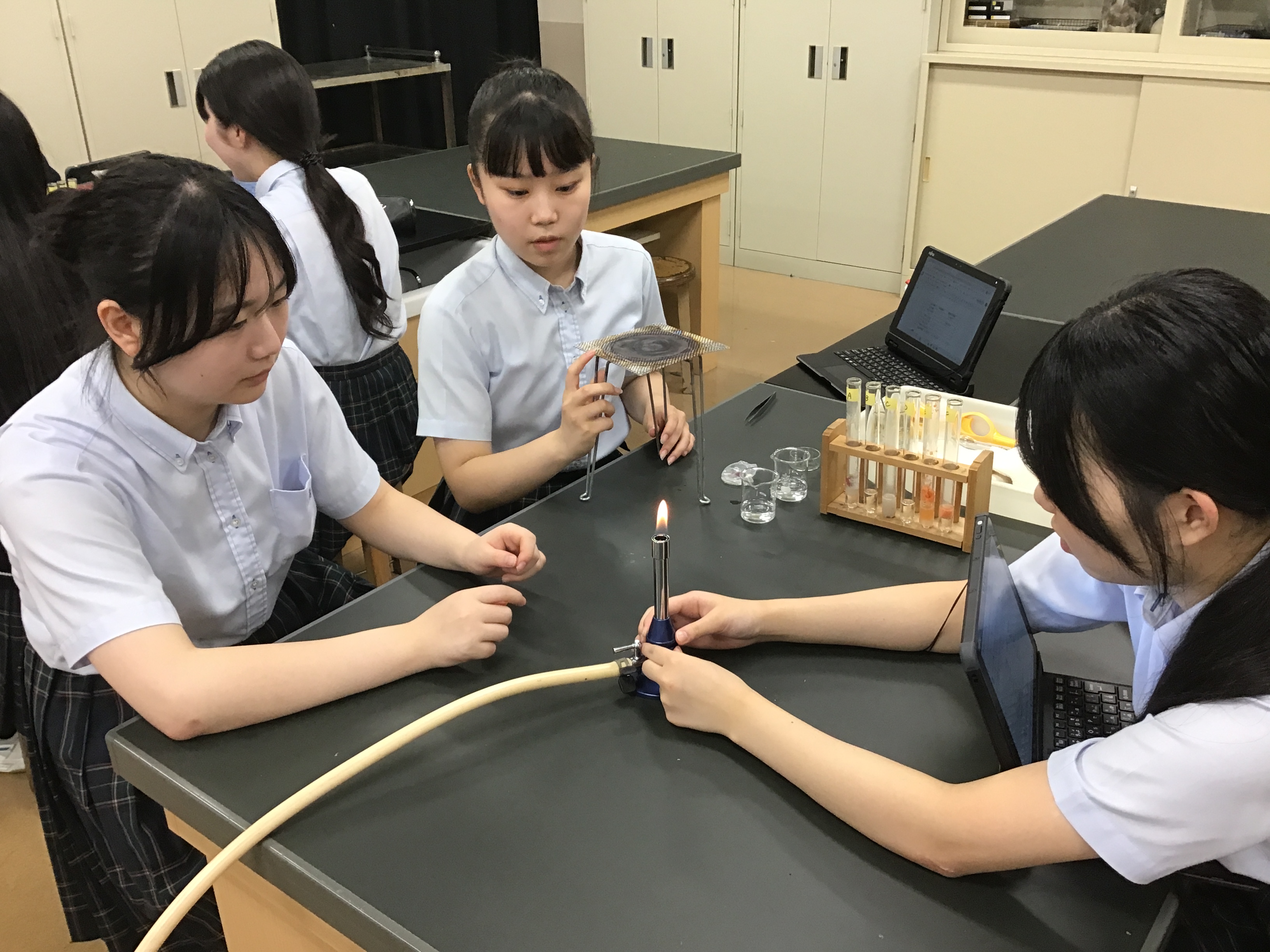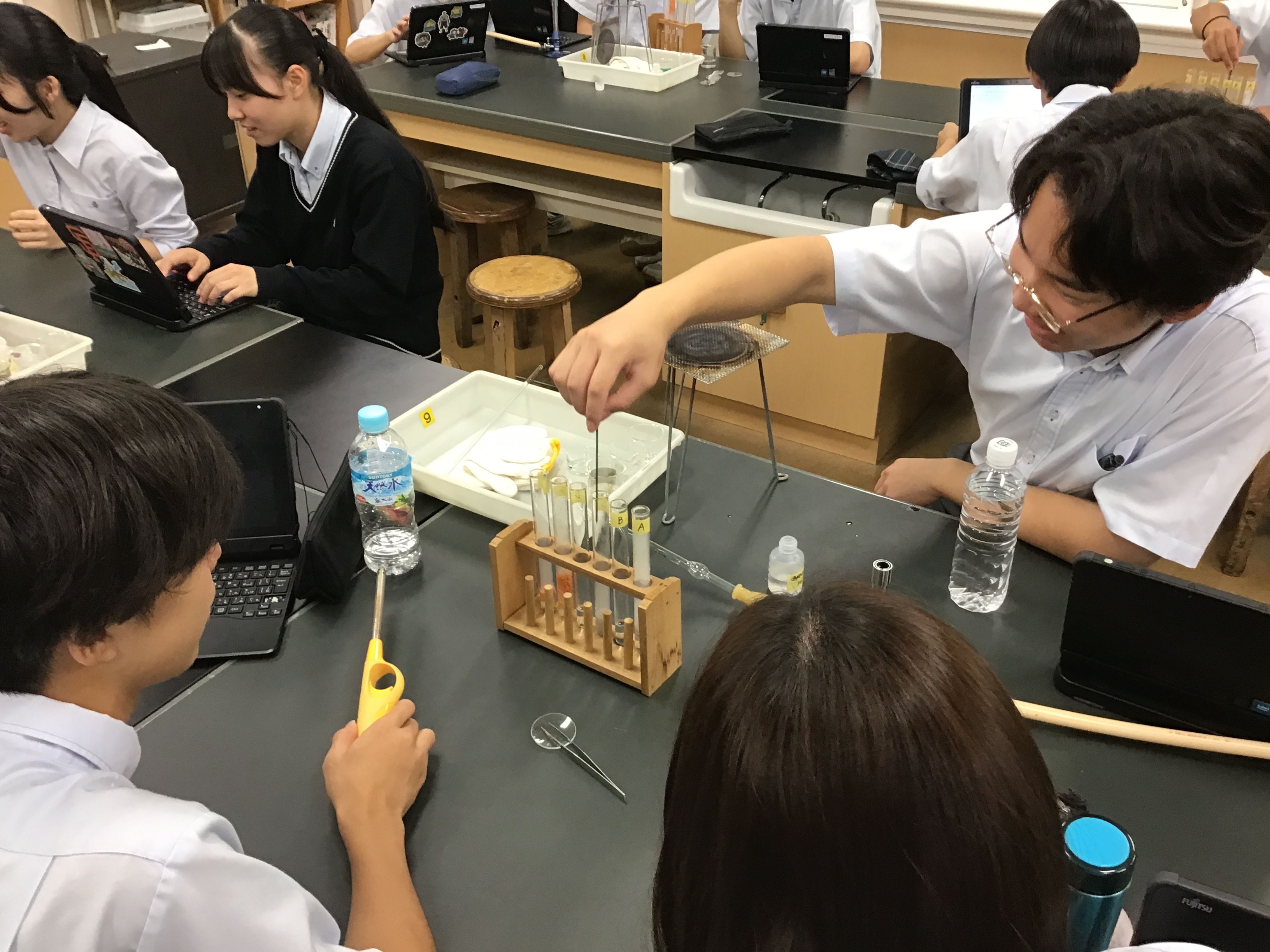 反応によって発生する気体(酸素)の量の違いを確かめるため、線香の火を試験管に入れて酸素の発生や燃え方の変化を確認しました。実際に目で見て反応を確かめることで、触媒のはたらきや酵素の性質について理解を深めることができました。