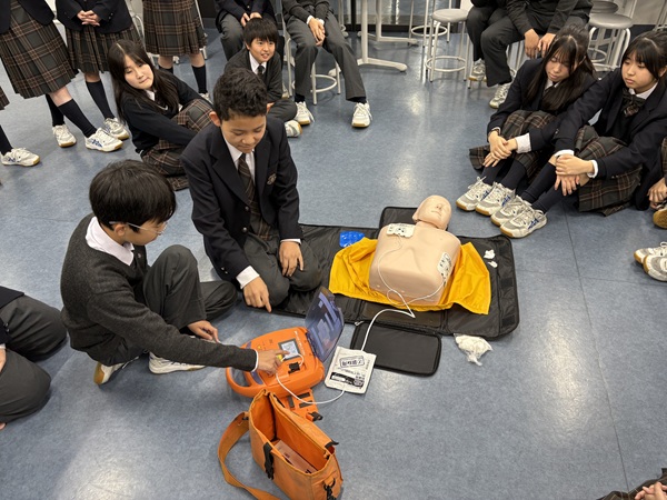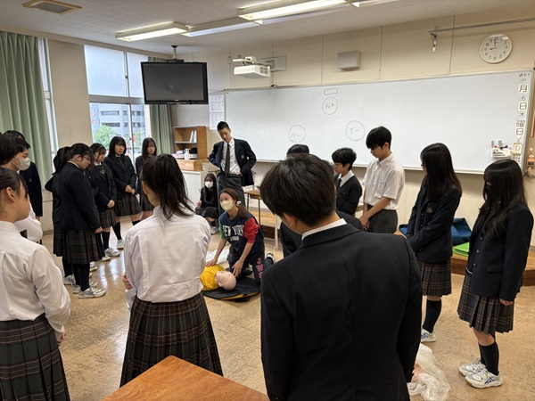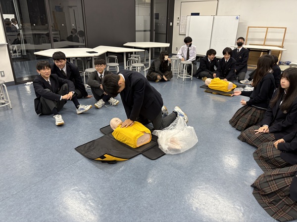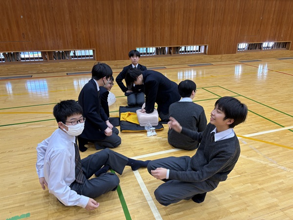 保健の授業で心肺蘇生法の実習を行いました。音楽に合わせながらリズムよく胸骨圧迫の練習をしたり、複数人で協力して流れを確認したりしました。 人命救助が必要になる場面はいつ・どこで・誰が遭遇する変わりません。そういった場面に遭遇した時に率先して対応できるよう、授業で行ったことをしっかりと復習しておきましょう。