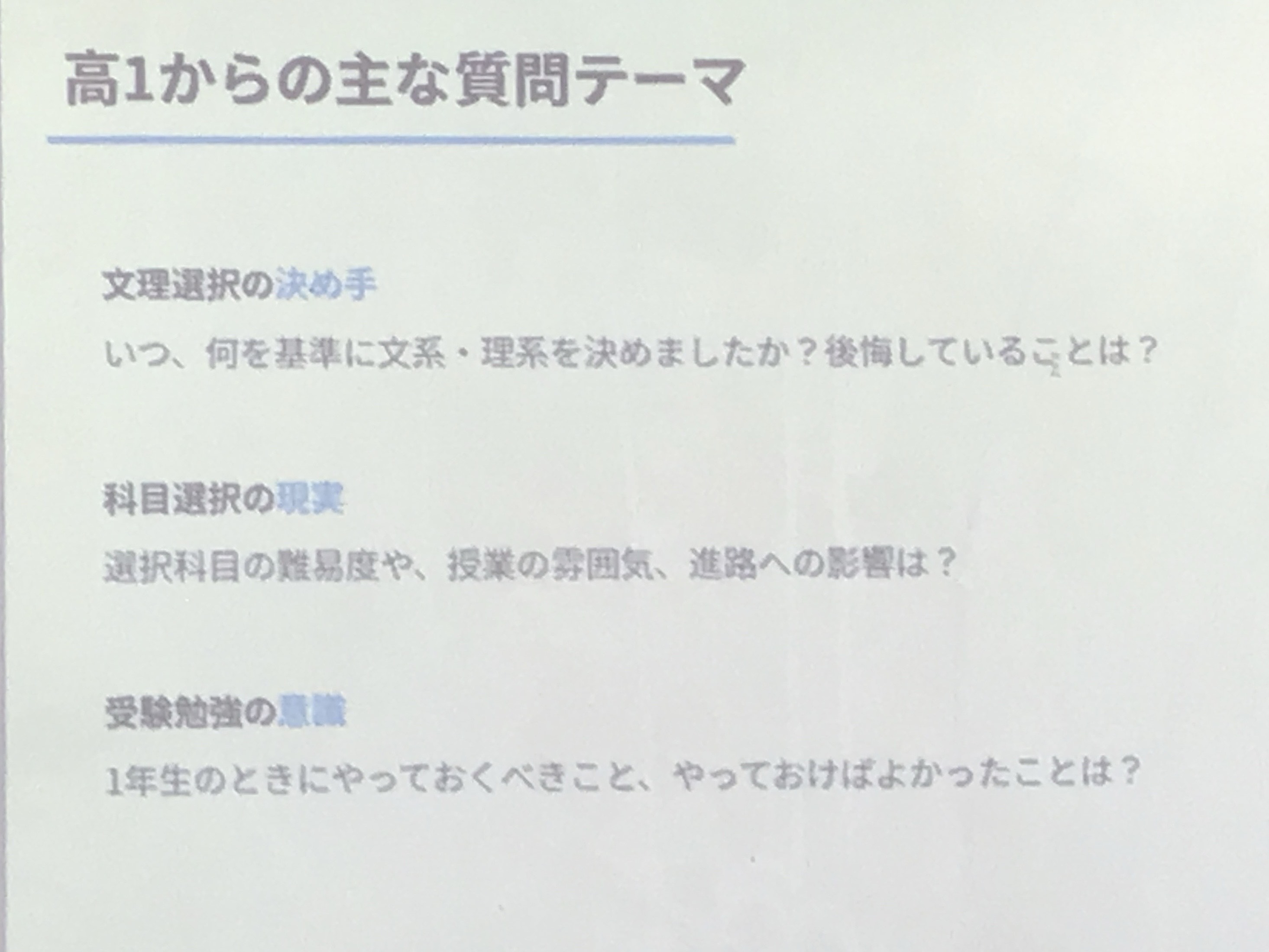 質問内容は、文理選択や科目選択に関するものが中心であり、2年生の具体的な体験談には説得力がありました。先輩の話に大きく頷きながら耳を傾ける1年生の姿も多く見られ、進路に対する意識を高める機会となりました。