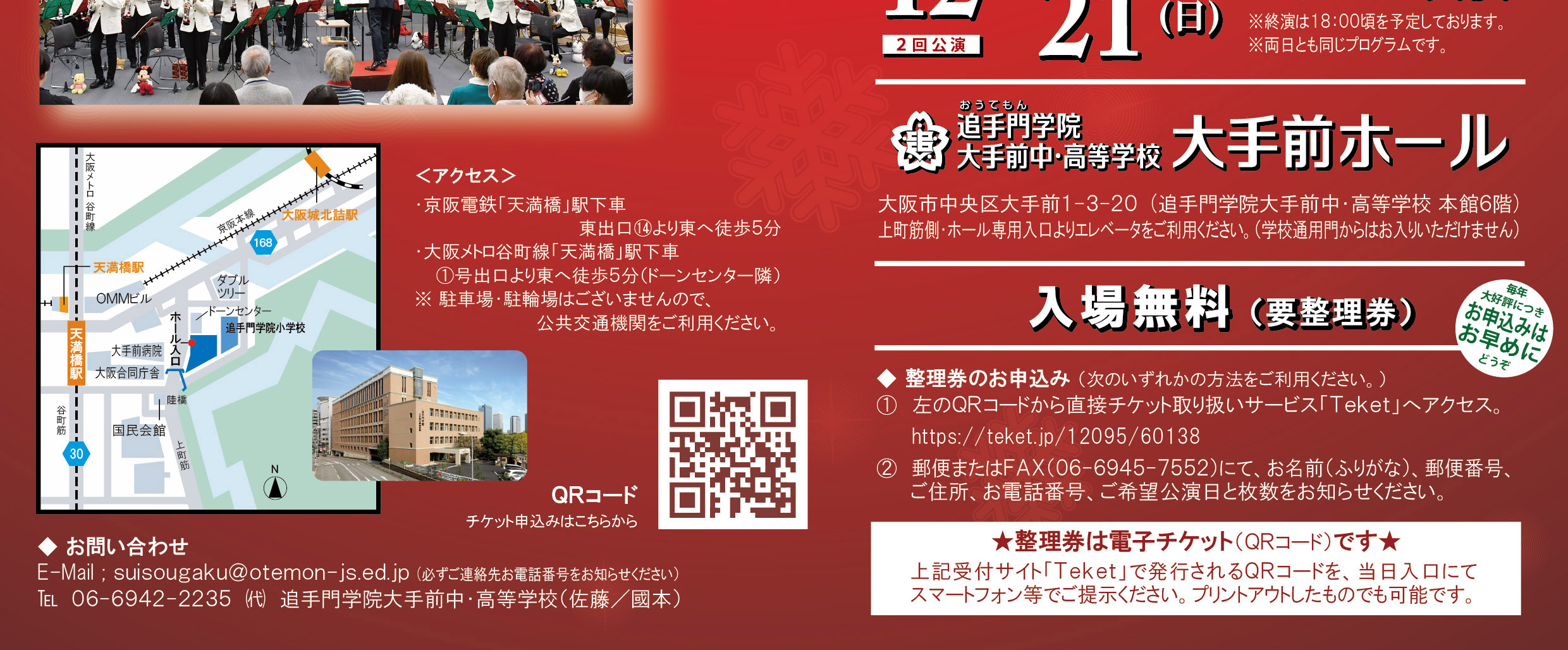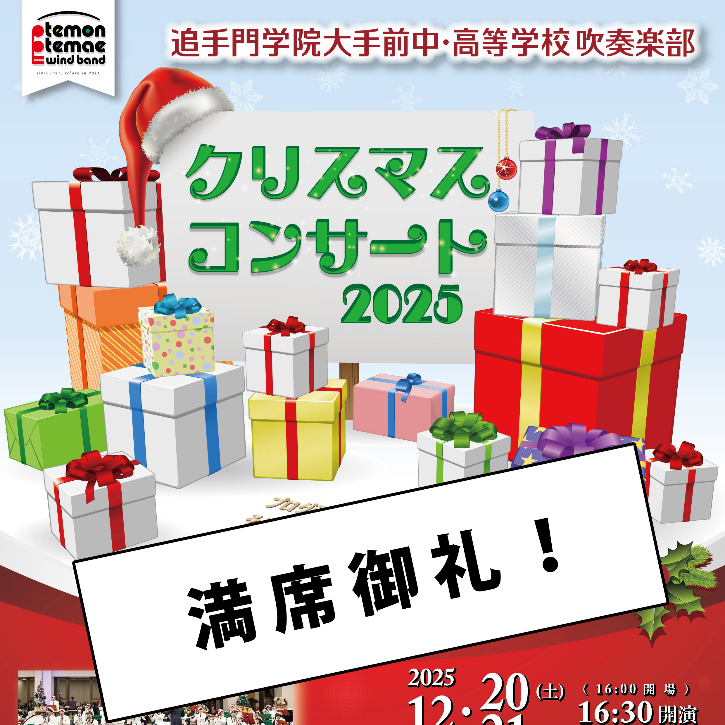クリスマスコンサート2025の入場整理券ですが、7日目にて定員に達したため、お申込みを締め切らせていただきました。 今年も多数のお申込み、誠にありがとうございました。 当日、皆さまにお会いできるのを楽しみにしております。