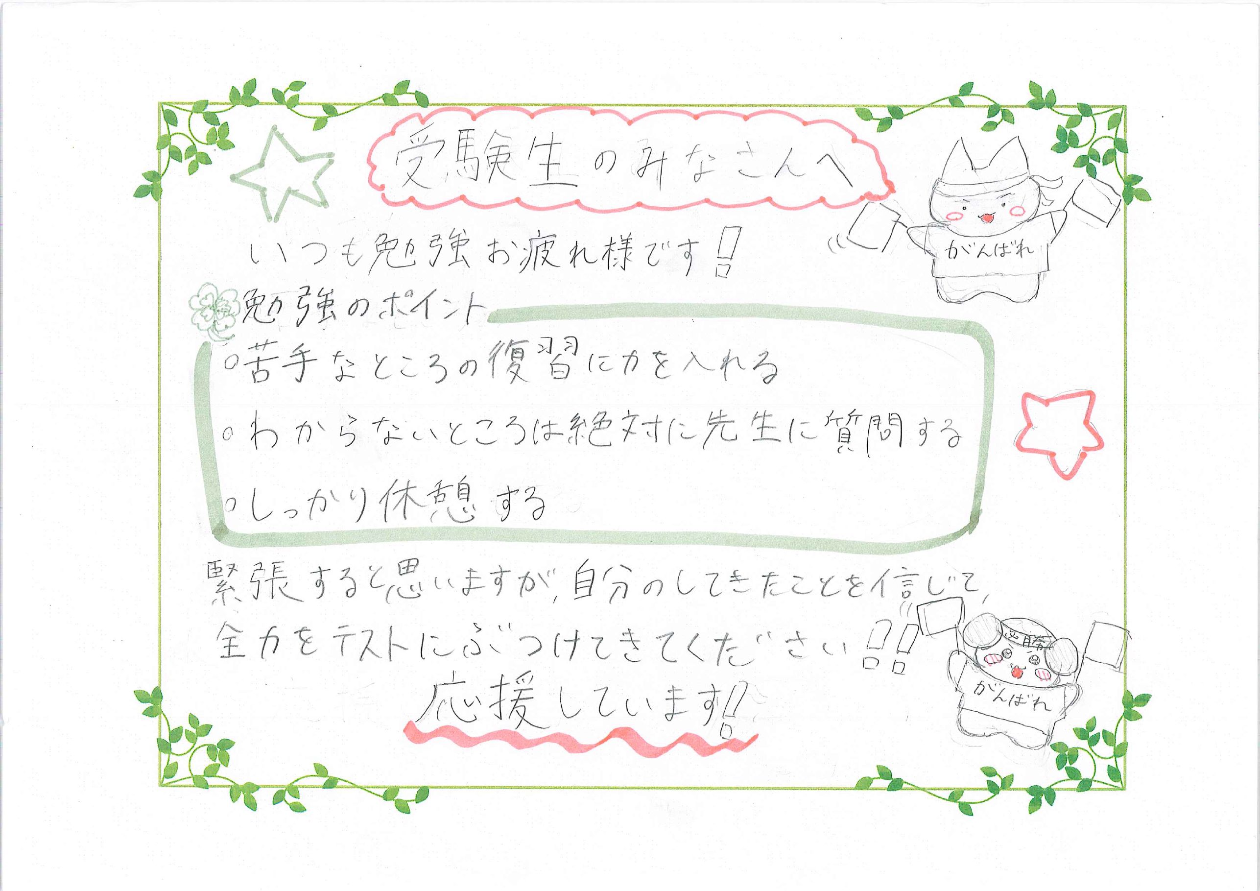 中学受験生の皆さん、応援メッセージを読んで引き続き受験勉強を頑張ってください。