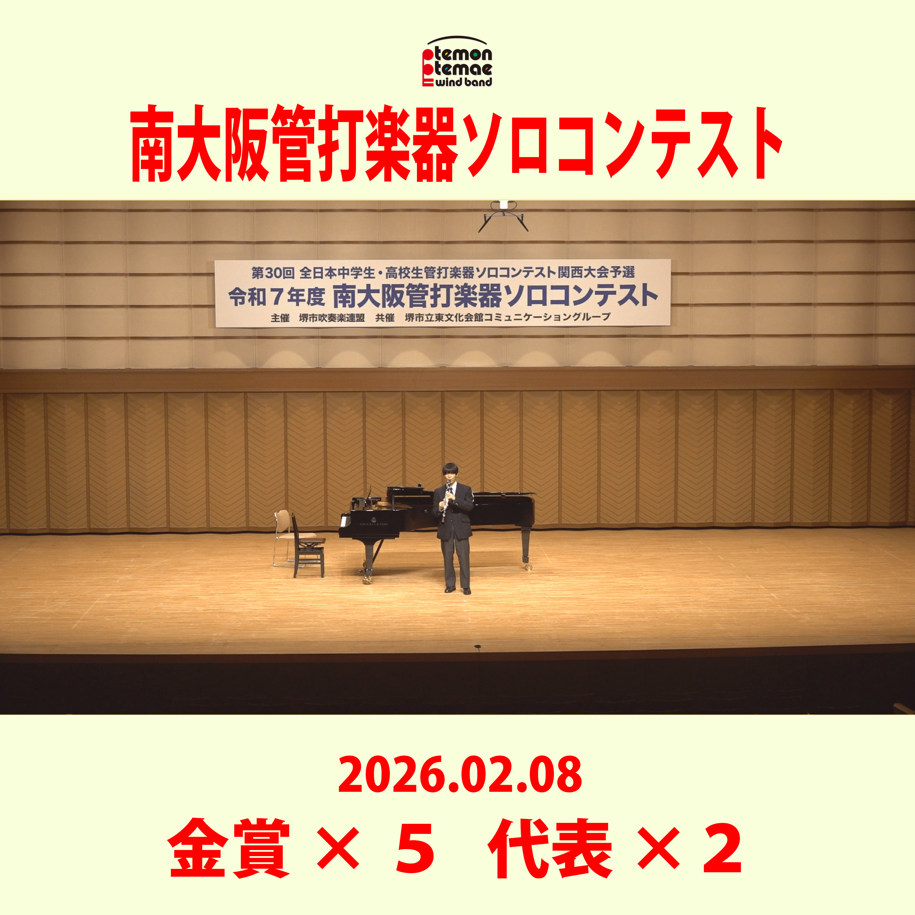 2026年2月8日に開催された「第9回南大阪管打楽器ソロコンテスト」において、中学生2名、高校生3名が金賞!