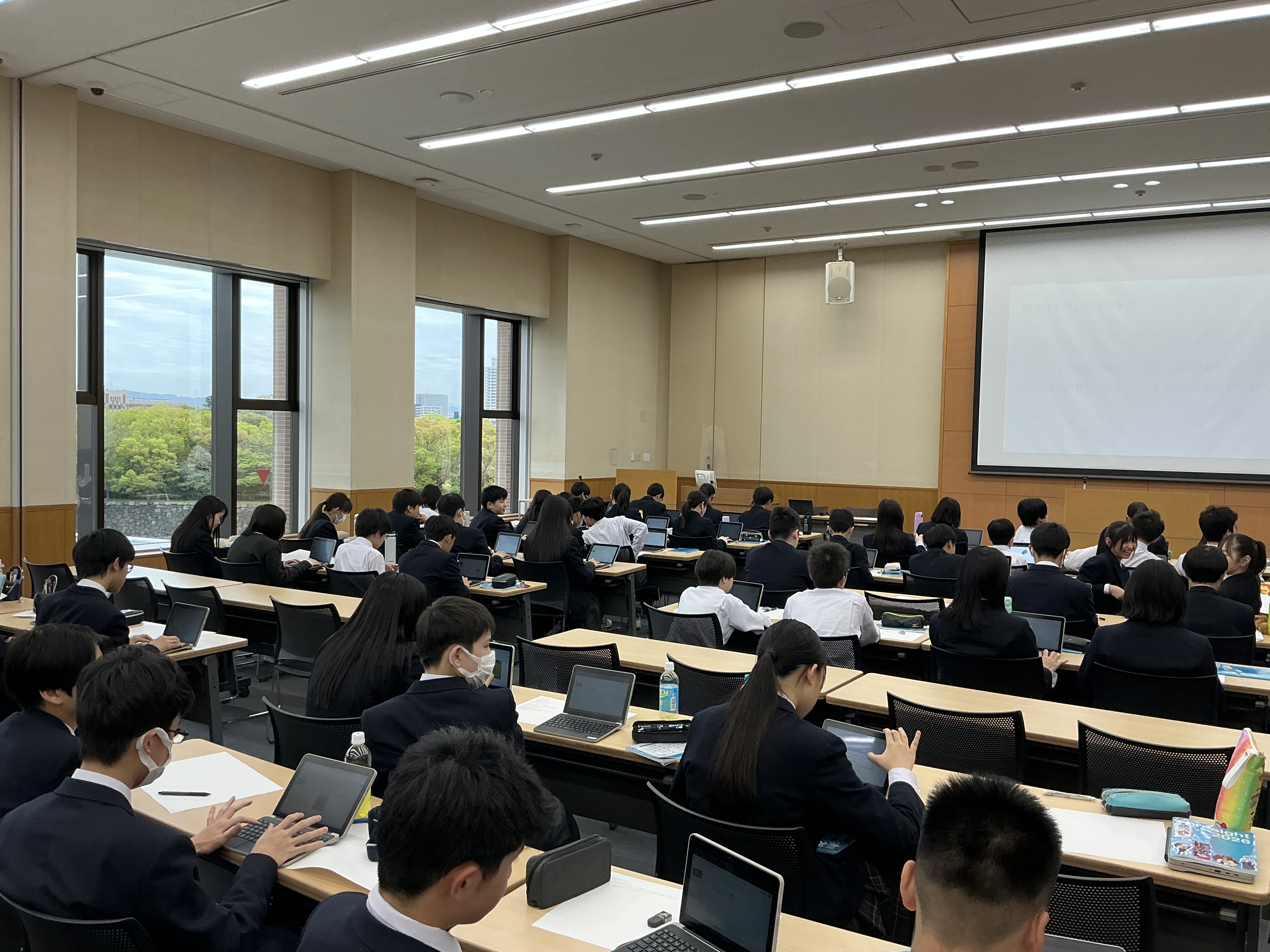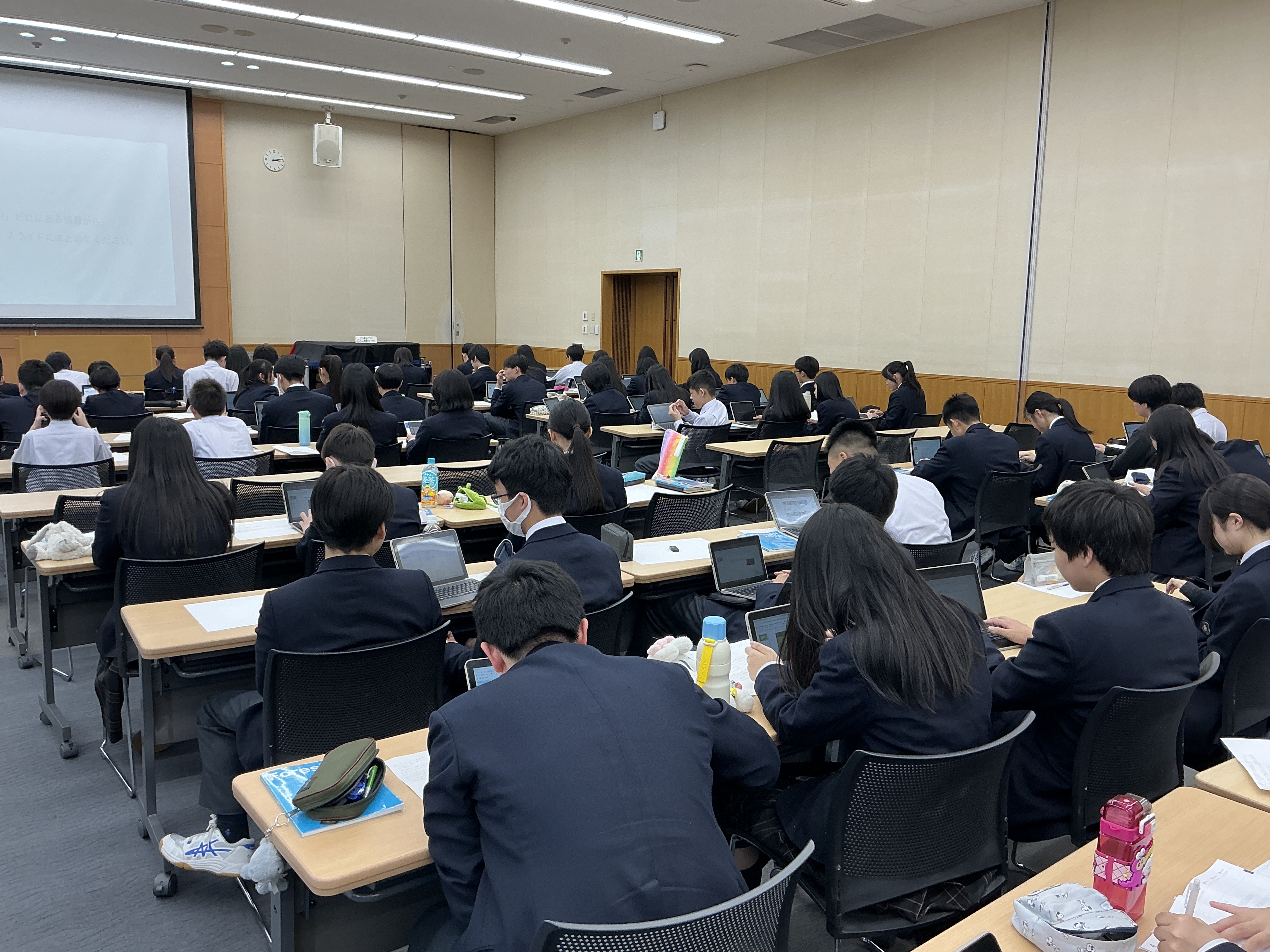 本日から授業がスタートしました。「探究」では、11月に実施される「岡山探究旅行」に向けての活動です。初回の本日は岡山県真備町の方の講演を聞き、講演の内容を各自スライドにまとめました。探究旅行が充実したものになるよう、1年間頑張っていきましょう!