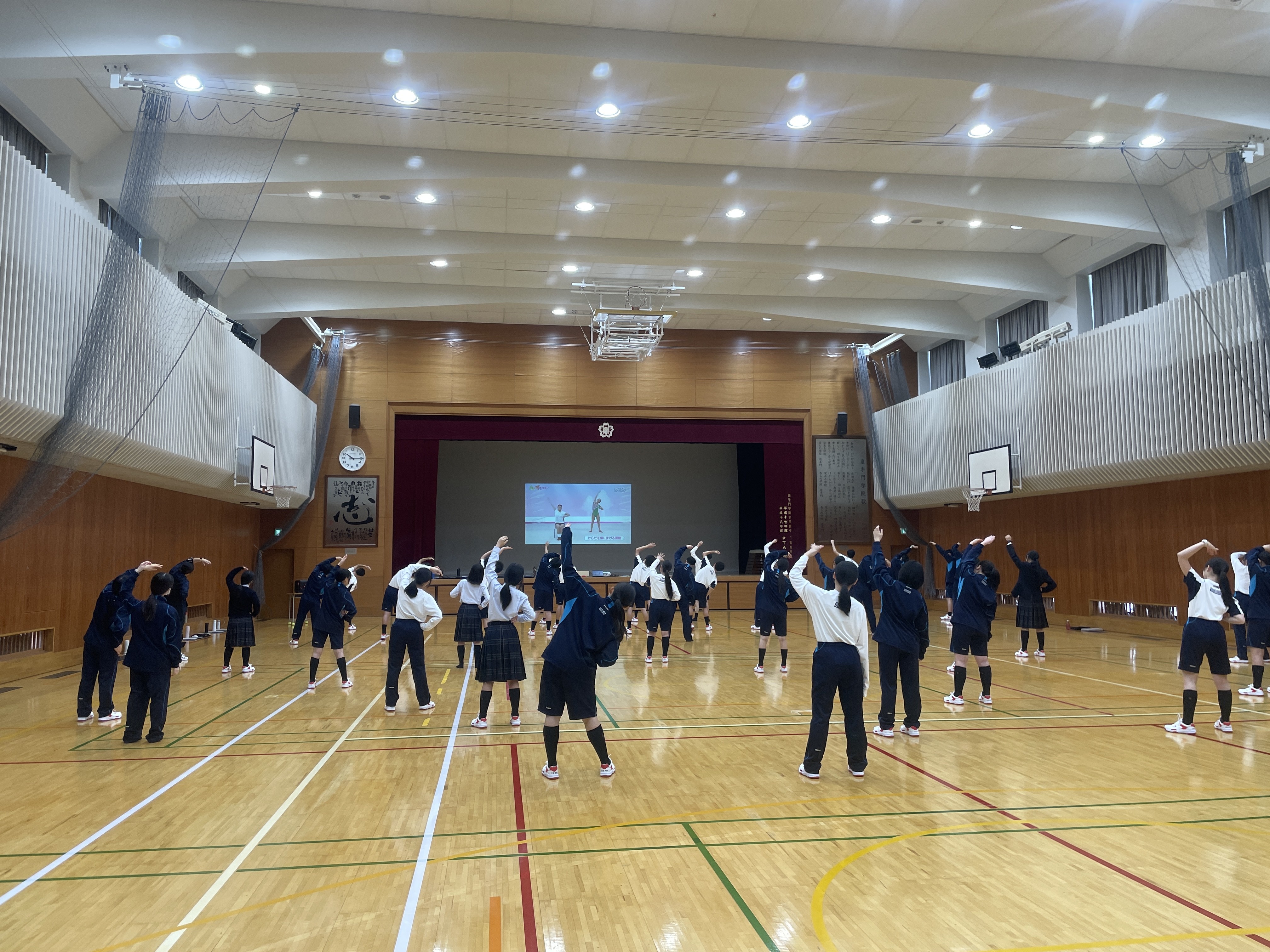 本日高校1年生のGAGSの体育の授業でラジオ体操第2を実施しました。 体育館種目の初回授業もあり、教員の自己紹介と体育の諸注意と1学期の成績ガイダンスも行いました。 授業の後半は、みんなでラジオ体操第2を画面も見ながら覚えました。 本校は、主運動の前にWUPでラジオ体操第2を行うので、みんなで覚えましょう!!!