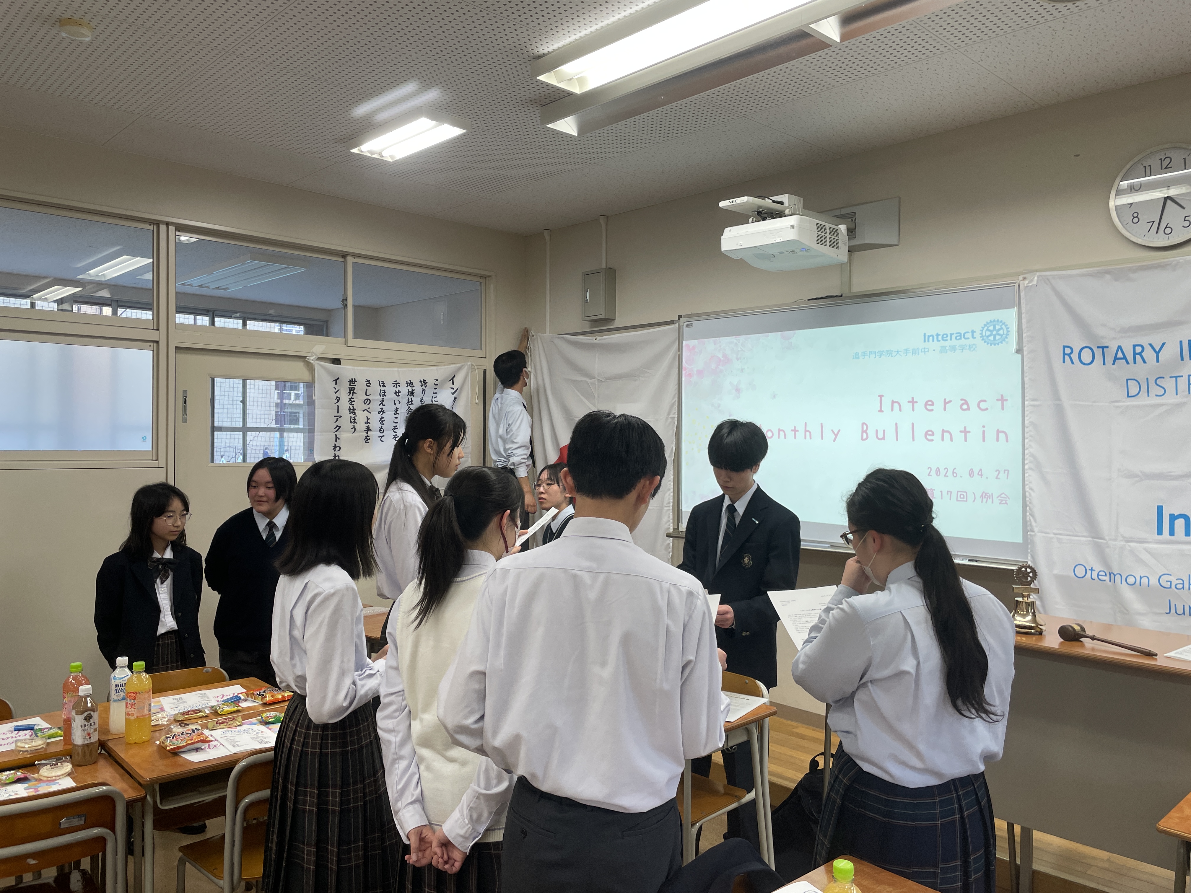 本日、2026年度のインターアクトの例会が実施されました。 会長の方から、「インターアクトとは?」の説明を受けて、方針や今後のスケジュールを確認しました。 新たなメンバーを加えての活動が始まります。 今後は、例会+活動日+イベント+海外研修など盛りだくさんな一年になりそうです!! 5分卓話 テーマ「音楽と私」 高校1年生 「持たないという豊かさ」 中学3年生 頑張れるインターアクト!!!